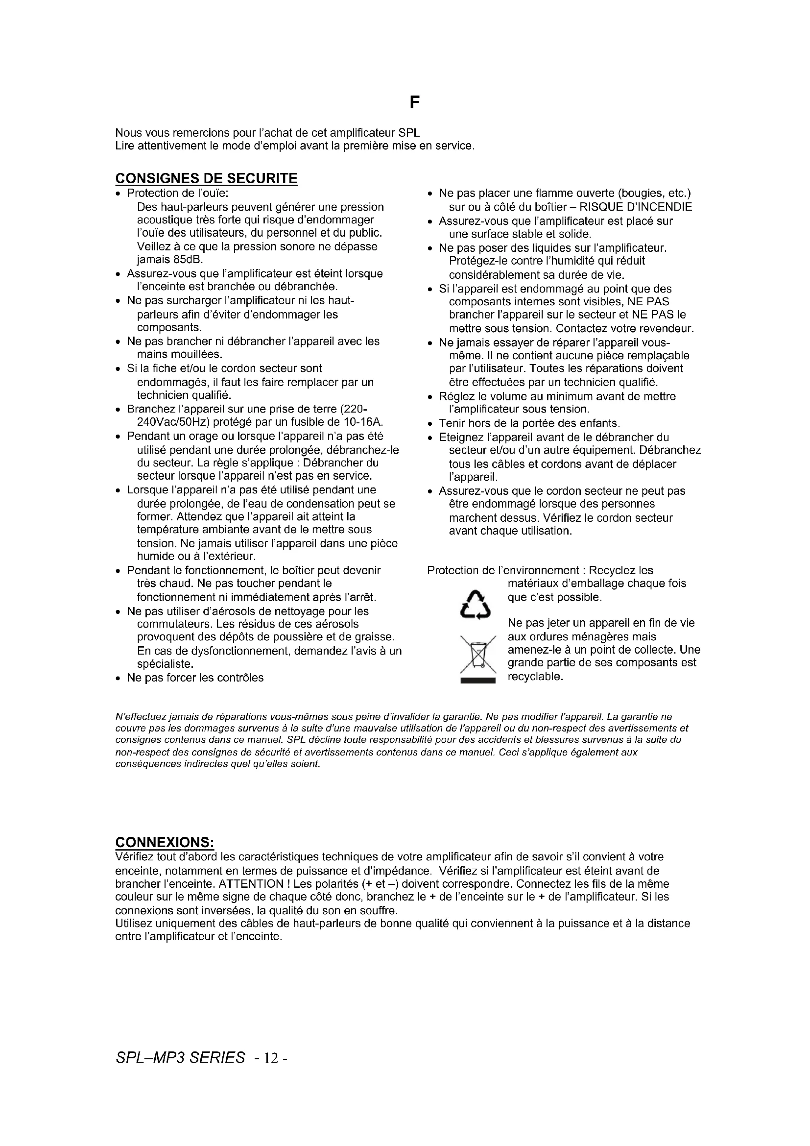 CONNEXIONS: Vérifiez tout d’abord les caractéristiques techniques de votre amplificateur afin de savoir s’il convient à votre enceinte, notamment en termes de puissance et d’impédance. Vérifiez si l’amplificateur est éteint avant de brancher l’enceinte. ATTENTION ! Les polarités (+ et –) doivent correspondre. Connectez les fils de la même couleur sur le même signe de chaque côté donc, branchez le + de l’enceinte sur le + de l’amplificateur. Si les connexions sont inversées, la qualité du son en souffre. Utilisez uniquement des câbles de haut-parleurs de bonne qualité qui conviennent à la puissance et à la distance entre l’amplificateur et l’enceinte.SPL–MP3 SERIES - 13 - DESCRIPTION