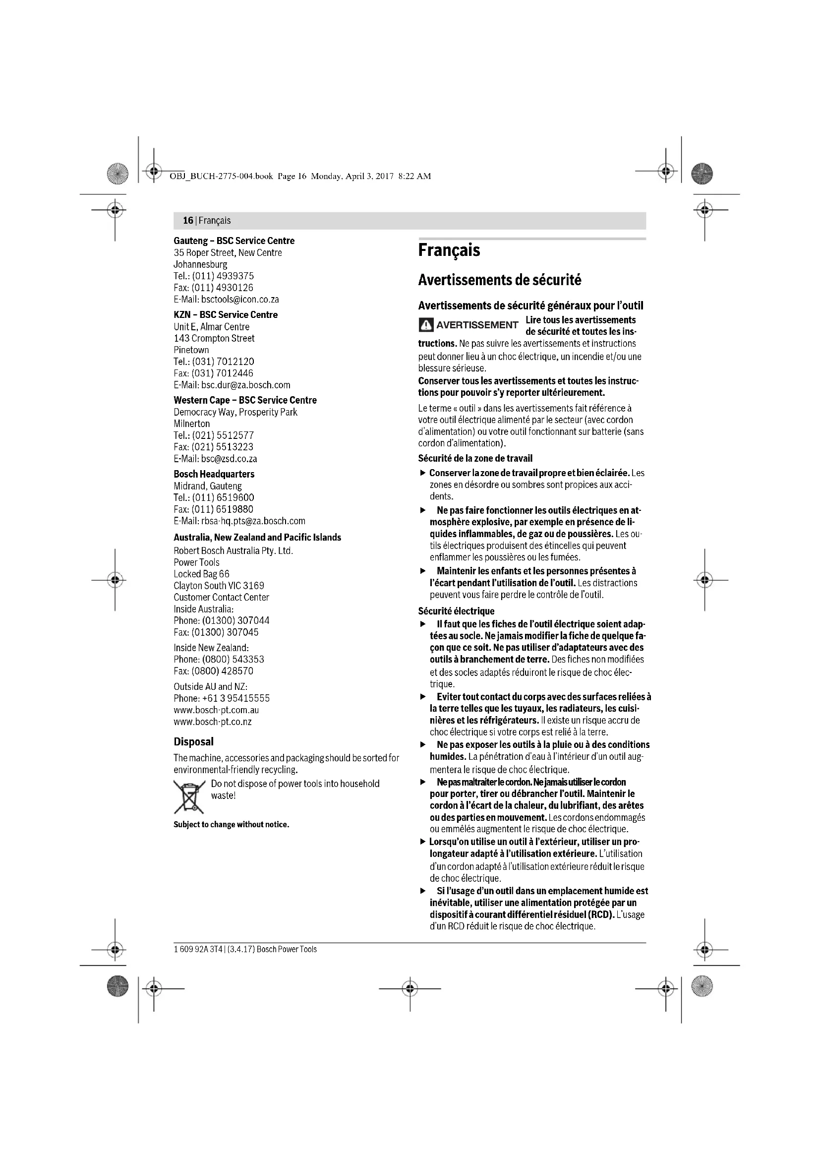 TRIPOLI Tel: 00219 21 4811184 Oman Malatan Trading & Contracting LLC P.O. Box 131 Ruwi, 112 Sultanate of Oman Phone: +968 99886794 E-mail: malatanpowertools@malatan.net Qatar International Construction Solutions W L L P O Box 51. Doha. Phone: +974 40065458 Fax: +974 4453 8585 E-mail: csd@icsdoha.com Saudi Arabia Juffali Technical Equipment Co. (JTECO) Kilo 14, Madinah Road, Al Bawadi District Jeddah 21431 Phone: +966 2 6672222 Ext. 1528 Fax: +966 2 6676308 E-mail: roland@eajb.com.sa Syria Dallal Establishment for Power Tools P.O. Box 1030 Aleppo Phone: +963212116083 Email: rita.dallal@hotmail.com United Arab Emirates Central Motors & Equipment LLC, P.O. Box 1984 Al-Wahda Street - Old Sana Building Sharjah Phone: +971 6 593 2777 Fax: +971 6 533 2269 E-mail: powertools@centralmotors.ae Yemen Abualrejal Trading Corporation Sana’a Zubiery St. Front to new Parliament Building Phone: +967-1-202010 Fax: +967-1-279029 Email: tech-tools@abualrejal.com Ethiopia Forever plc Kebele 2,754, BP 4806, Addis Ababa Tel: +251 111 560 600 E-Mail: foreverplc@ethionet.et Ghana C.WOERMANN LTD. Nsawam Road / Avenor Junction, P.O Box 1779 Accra Tel : 00233 302 225 141 Kenya Robert Bosch East Africa Ltd Mpaka Road P.O. Box 856 00606 Nairobi -Kenya Nigeria Robert Bosch Nigeria Ltd. 52-54 Isaac John street P.O. Box GRA Ikeja – Lagos Republic of South Africa Customer service Hotline: (011) 6519600 Gauteng – BSC Service Centre 35 Roper Street, New Centre Johannesburg Tel.: (011) 4939375 Fax: (011) 4930126 E-Mail: bsctools@icon.co.za KZN – BSC Service Centre Unit E, Almar Centre 143 Crompton Street Pinetown Tel.: (031) 7012120 Fax: (031) 7012446 E-Mail: bsc.dur@za.bosch.com Western Cape – BSC Service Centre Democracy Way, Prosperity Park Milnerton Tel.: (021) 5512577 Fax: (021) 5513223 E-Mail: bsc@zsd.co.za Bosch Headquarters Midrand, Gauteng Tel.: (011) 6519600 Fax: (011) 6519880 E-Mail: rbsa-hq.pts@za.bosch.com Tanzania Diesel & Autoelectric Service Ltd. 117 Nyerere Rd. P.O. BOX 70839, Vingunguti 12109 Dar Es Salaam Tel : 00255 222 861 793/794 Republic of South Africa Customer service Hotline: (011) 6519600 OBJ_BUCH-2775-004.book Page 15 Monday, April 3, 2017 8:22 AM16 | Français 1 609 92A 3T4 | (3.4.17) Bosch Power Tools Gauteng – BSC Service Centre 35 Roper Street, New Centre Johannesburg Tel.: (011) 4939375 Fax: (011) 4930126 E-Mail: bsctools@icon.co.za KZN – BSC Service Centre Unit E, Almar Centre 143 Crompton Street Pinetown Tel.: (031) 7012120 Fax: (031) 7012446 E-Mail: bsc.dur@za.bosch.com Western Cape – BSC Service Centre Democracy Way, Prosperity Park Milnerton Tel.: (021) 5512577 Fax: (021) 5513223 E-Mail: bsc@zsd.co.za Bosch Headquarters Midrand, Gauteng Tel.: (011) 6519600 Fax: (011) 6519880 E-Mail: rbsa-hq.pts@za.bosch.com Australia, New Zealand and Pacific Islands Robert Bosch Australia Pty. Ltd. Power Tools Locked Bag 66 Clayton South VIC 3169 Customer Contact Center Inside Australia: Phone: (01300) 307044 Fax: (01300) 307045 Inside New Zealand: Phone: (0800) 543353 Fax: (0800) 428570 Outside AU and NZ: Phone: +61 3 95415555 www.bosch-pt.com.au www.bosch-pt.co.nz Disposal The machine, accessories and packaging should be sorted for environmental-friendly recycling. Do not dispose of power tools into household waste! Subject to change without notice. Français Avertissements de sécurité Avertissements de sécurité généraux pour l’outil Lire tous les avertissements de sécurité et toutes les ins- tructions. Ne pas suivre les avertissements et instructions peut donner lieu à un choc électrique, un incendie et/ou une blessure sérieuse. Conserver tous les avertissements et toutes les instruc- tions pour pouvoir s’y reporter ultérieurement. Le terme « outil » dans les avertissements fait référence à votre outil électrique alimenté par le secteur (avec cordon d’alimentation) ou votre outil fonctionnant sur batterie (sans cordon d’alimentation). Sécurité de la zone de travail Conserver la zone de travail propre et bien éclairée. Les zones en désordre ou sombres sont propices aux acci- dents. Ne pas faire fonctionner les outils électriques en at- mosphère explosive, par exemple en présence de li- quides inflammables, de gaz ou de poussières. Les ou- tils électriques produisent des étincelles qui peuvent enflammer les poussières ou les fumées. Maintenir les enfants et les personnes présentes à l’écart pendant l’utilisation de l’outil. Les distractions peuvent vous faire perdre le contrôle de l’outil. Sécurité électrique Il faut que les fiches de l’outil électrique soient adap- tées au socle. Ne jamais modifier la fiche de quelque fa- çon que ce soit. Ne pas utiliser d’adaptateurs avec des outils à branchement de terre. Des fiches non modifiées et des socles adaptés réduiront le risque de choc élec- trique. Eviter tout contact du corps avec des surfaces reliées à la terre telles que les tuyaux, les radiateurs, les cuisi- nières et les réfrigérateurs. Il existe un risque accru de choc électrique si votre corps est relié à la terre. Ne pas exposer les outils à la pluie ou à des conditions humides. La pénétration d’eau à l’intérieur d’un outil aug- mentera le risque de choc électrique. Ne pas maltraiter le cordon. Ne jamais utiliser le cordon pour porter, tirer ou débrancher l’outil. Maintenir le cordon à l’écart de la chaleur, du lubrifiant, des arêtes ou des parties en mouvement. Les cordons endommagés ou emmêlés augmentent le risque de choc électrique. Lorsqu’on utilise un outil à l’extérieur, utiliser un pro- longateur adapté à l’utilisation extérieure. L’utilisation d’un cordon adapté à l’utilisation extérieure réduit le risque de choc électrique. Si l’usage d’un outil dans un emplacement humide est inévitable, utiliser une alimentation protégée par un dispositif à courant différentiel résiduel (RCD). L’usage d’un RCD réduit le risque de choc électrique. AVERTI