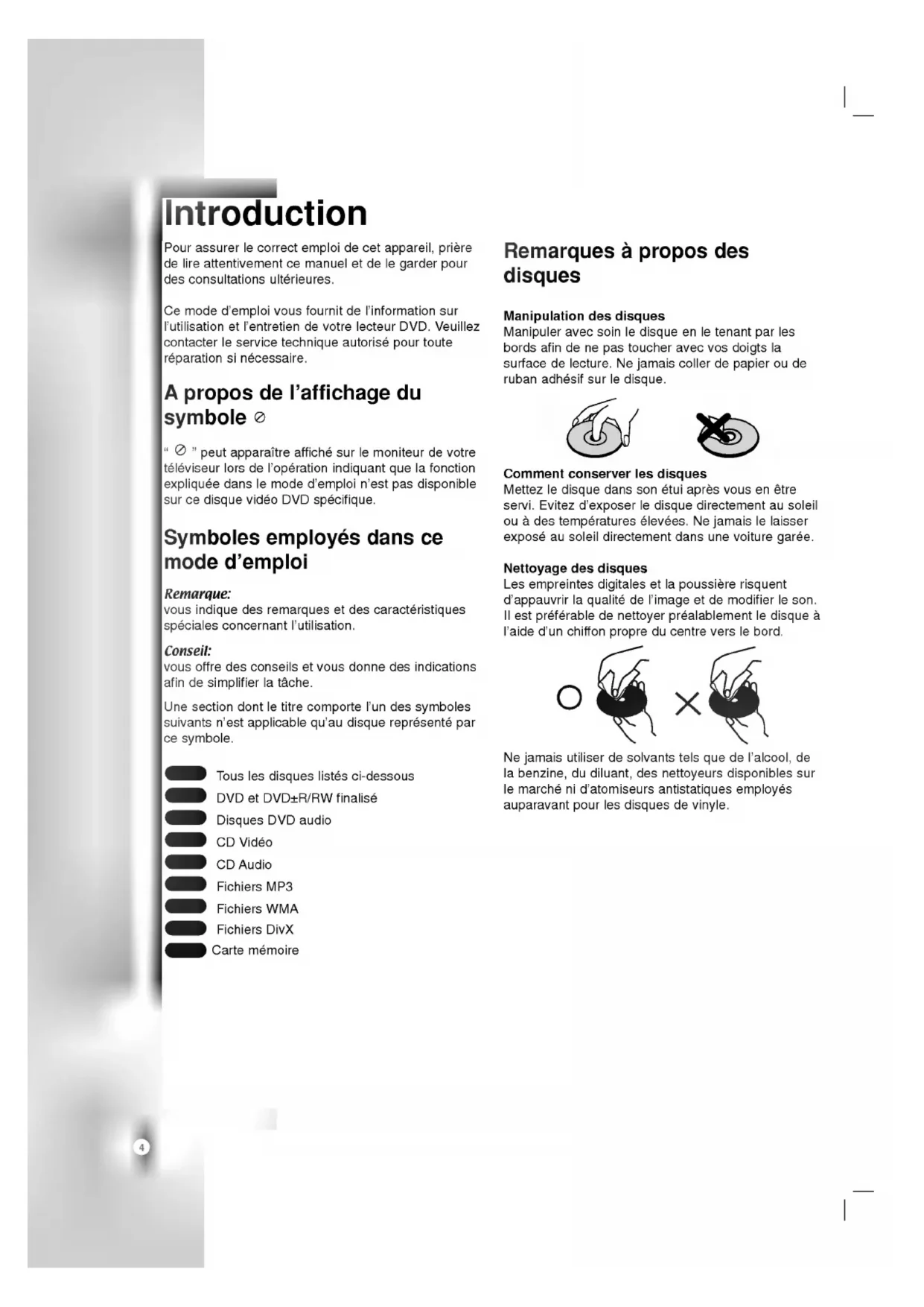 mode d'emploi Remarque: vousindiquedesremarquesetdescaracteristiquesspecialesconcernantl'utilisation. Conseil: vousoffredesconseilsetvousdonnedesindicationsafindesimplifierlatache.Unesectiondontletitre comporte l'undessymbolessuivantsn'estapplicablequ'audisquerepresenteparcesymbole.Touslesdisqueslistesci-dessousDVDetDVD±R/RWfinaliseDisquesDVDaudioCDVideoCDAudioFichiersMP3FichiersWMAFichiersDivXCartememoire Remarques