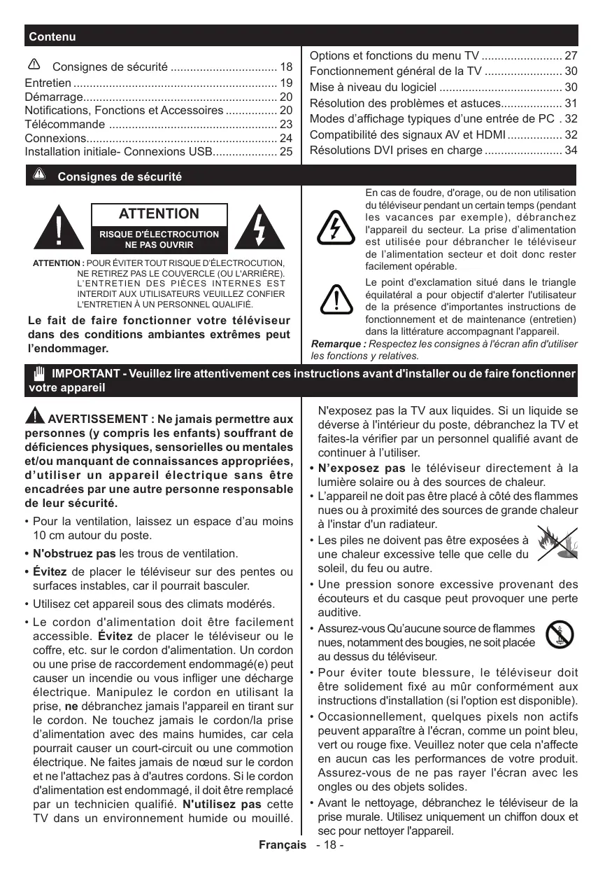 Options et fonctions du menu TV 27 Fonctionnement général de la TV 30 Mise à niveau du logiciel 30 Résolution des problèmes et astuces 31 Modes d’affichage typiques d’une entrée de PC .. 32 Compatibilité des signaux AV et HDMI 32 Résolutions DVI prises en charge 34