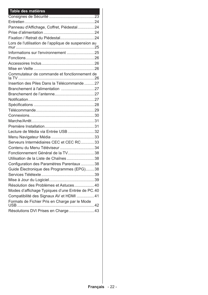 Table des matières Consignes de Sécurité23 Entretien24 Panneau d'Affichage, Coffret, Piédestal24 Prise d’alimentation24 Fixation / Retrait du Piédestal24 Lors de l'utilisation de l’applique de suspension au mur25 Informations sur l'environnement25 Fonctions26 Accessoires Inclus26 Mise en Veille26 Commutateur de commande et fonctionnement de la TV26 Insertion des Piles Dans la Télécommande27 Branchement à l'alimentation 27 Branchement de l’antenne27 Notification27 Spécifications28 Télécommande29 Connexions30 Marche/Arrêt31 Première Installation31 Lecture de Média via Entrée USB32 Menu Navigateur Média33 Serveurs Intermédiaires CEC et CEC RC33 Contenu du Menu Téléviseur34 Fonctionnement Général de la TV38 Utilisation de la Liste de Chaînes38 Configuration des Paramètres Parentaux38 Guide Électronique des Programmes (EPG)38 Services Télétexte39 Mise à Jour du Logiciel39 Résolution des Problèmes et Astuces40 Modes d’affichage Typiques d’une Entrée de PC.. 40 Compatibilité des Signaux AV et HDMI41 Formats de Fichier Pris en Charge par le Mode USB42 Résolutions DVI Prises en Charge43