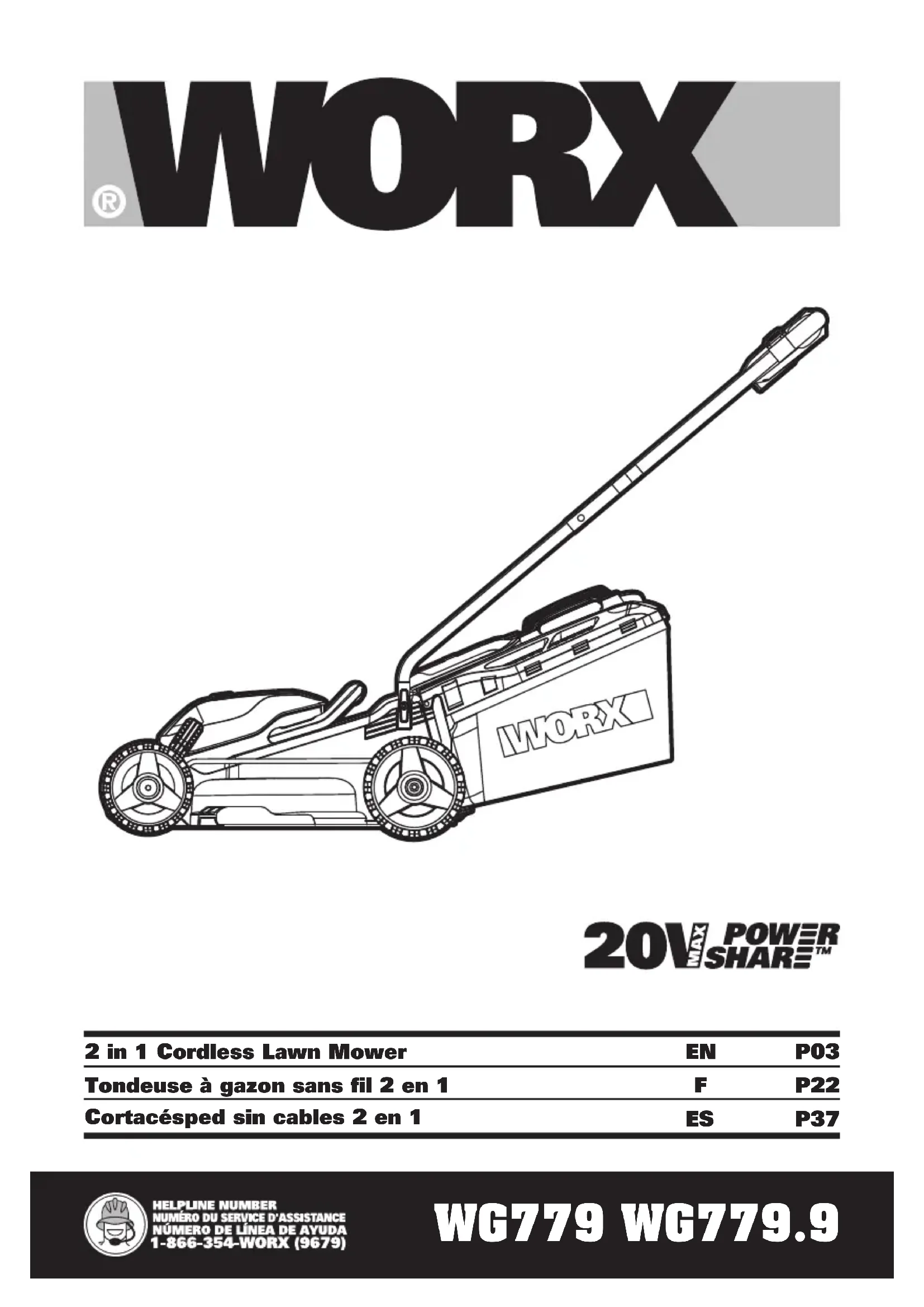 Poids de la machine 13.2kg (29.1lbs) 11.9kg (26.2lbs) ** Tension mesurée hors fonctionnement. La tension initiale de la batterie atteint le maximum de 20 volts. La tension nominale est de 18 V. ACCESSOIRES WG779 WG779.9 Blocs-piles (WA3578) 2 / Chargeur (WA3875) 1 / Sac à herbe 1 Dispositif de paillage 1 Serre-câbles 2 N’utilisez que les accessoires compatibles à cet outil. Les informations des accessoires peuvent être trouvées sur l’emballage du produit, chez un détaillant WORX ou sur notre site www.worx. com.Tondeuse à gazon sans fil 2 en 1 F