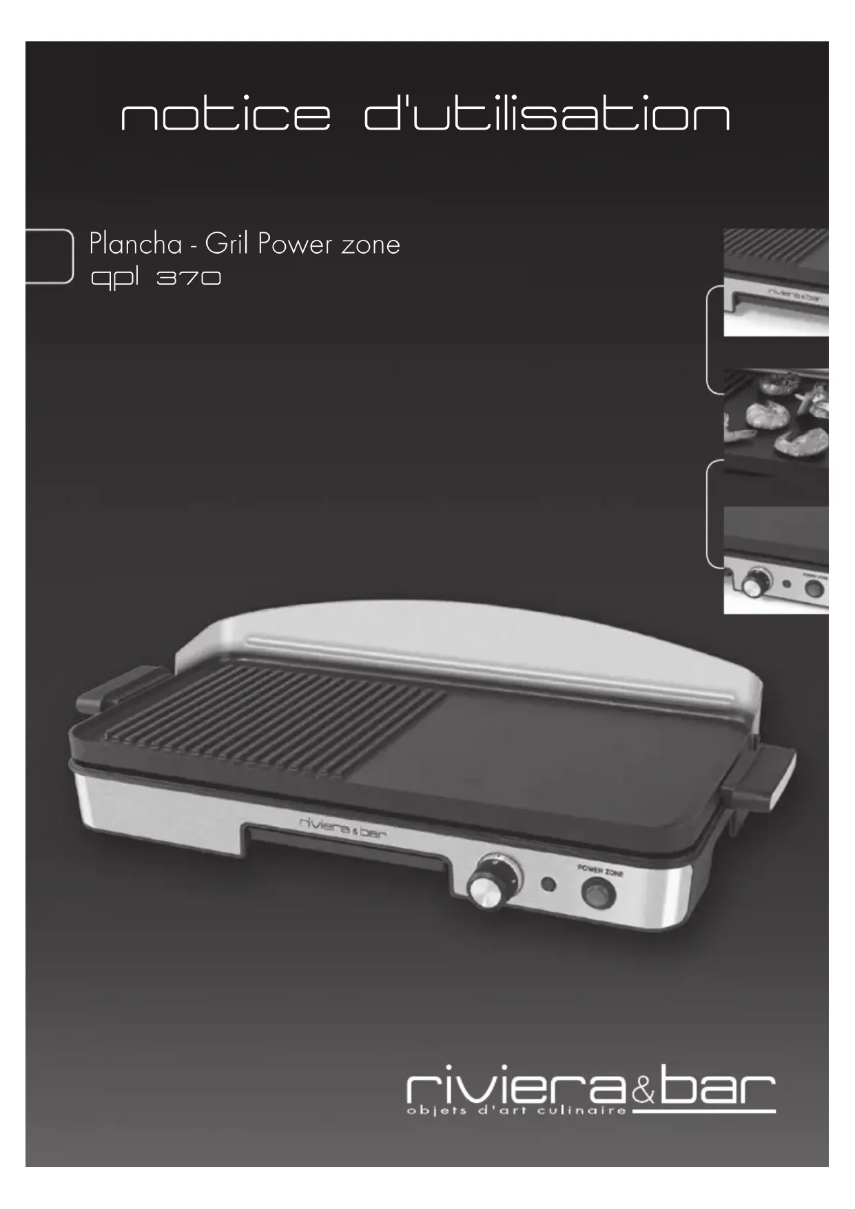 notice d'utilisation Plancha - Gril Power zone qpl 370Avec cet appareil, vous avez fait l’acquisition d’un article de qualité, bénéficiant de toute l’expérience de Riviera & Bar dans le domaine de la cuisson. Il répond aux critères de qualité Riviera & Bar : les meilleurs matériaux et composants ont été utilisés pour sa fabrication, et il a été soumis à des contrôles rigoureux. Nous souhaitons que son usage vous apporte entière satisfaction. Nous vous demandons de lire très attentivement les instructions indiquées dans cette notice, car elles fournissent, entre autres, des informations importantes relatives à la sécurité d’installation, d’utilisation et d’entretien. Gardez votre notice, vous pourriez avoir besoin de vous y référer dans le futur.