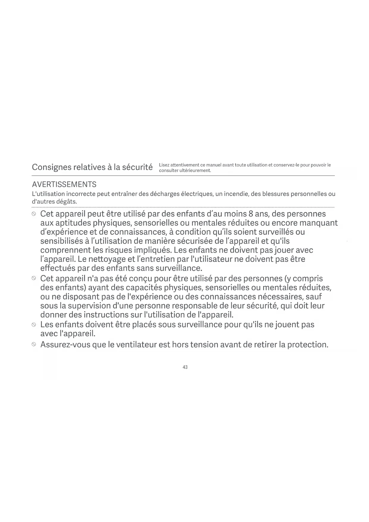 Cet appareil peut être utilisé par des enfants d’au moins 8 ans, des personnes aux aptitudes physiques, sensorielles ou mentales réduites ou encore manquant d’expérience et de connaissances, à condition qu’ils soient surveillés ou sensibilisés à l’utilisation de manière sécurisée de l’appareil et qu'ils comprennent les risques impliqués. Les enfants ne doivent pas jouer avec l’appareil. Le neoyage et l’entretien par l'utilisateur ne doivent pas être effectués par des enfants sans surveillance. Cet appareil n'a pas été conçu pour être utilisé par des personnes (y compris des enfants) ayant des capacités physiques, sensorielles ou mentales réduites, ou ne disposant pas de l'expérience ou des connaissances nécessaires, sauf sous la supervision d'une personne responsable de leur sécurité, qui doit leur donner des instructions sur l'utilisation de l'appareil. L'utilisation incorrecte peut entraîner des décharges électriques, un incendie, des blessures personnelles ou d'autres dégâts. AVERTISSEMENTS Les enfants doivent être placés sous surveillance pour qu'ils ne jouent pas avec l'appareil. Assurez-vous que le ventilateur est hors tension avant de retirer la protection.44 Ce produit contient des piles non remplaçables.