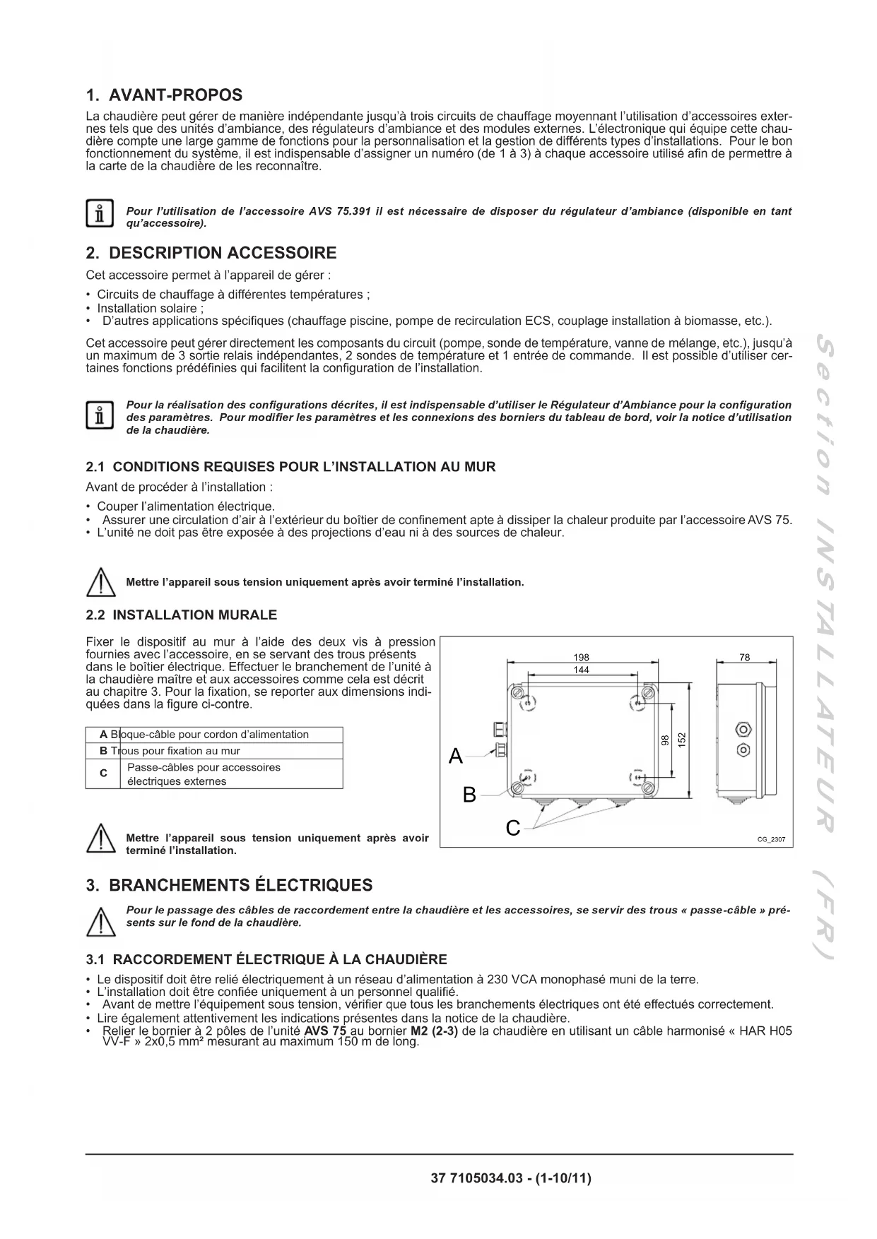 Pièces électriques sous tension, risque de choc électrique. INFORMATIONS IMPORTANTES Informations à lire très attentivement car elles sont utiles pour le fonctionnement correct de la chaudière.37 7105034.03 - (1-10/11) S e c t i o n I N S TA L L AT E U R ( F R )