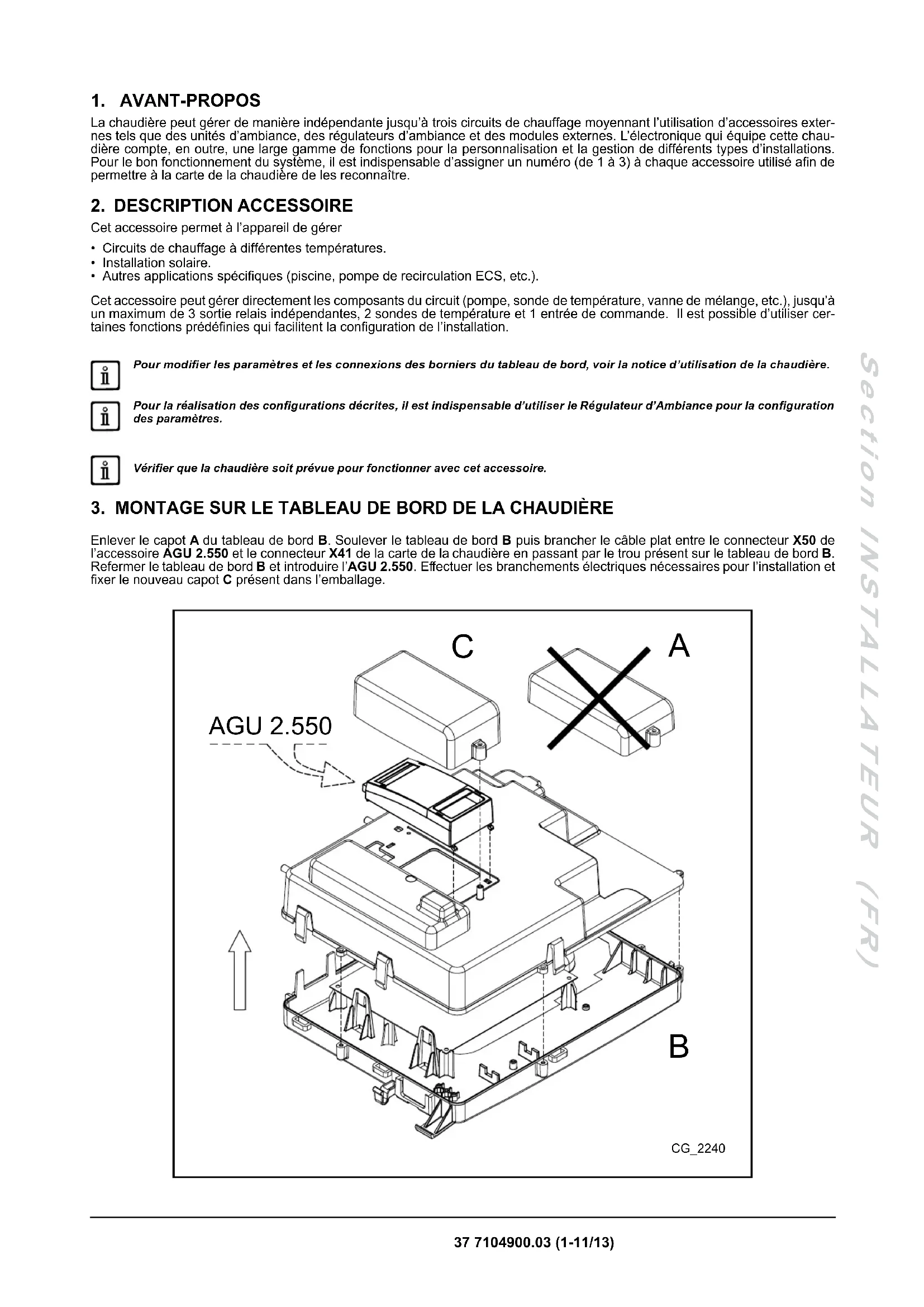 Enlever le capot A du tableau de bord B. Soulever le tableau de bord B puis brancher le câble plat entre le connecteur X50 de l’accessoire AGU 2.550 et le connecteur X41 de la carte de la chaudière en passant par le trou présent sur le tableau de bord B. Refermer le tableau de bord B et introduire l’AGU 2.550. Effectuer les branchements électriques nécessaires pour l’installation et xer le nouveau capot C présent dans l’emballage.
