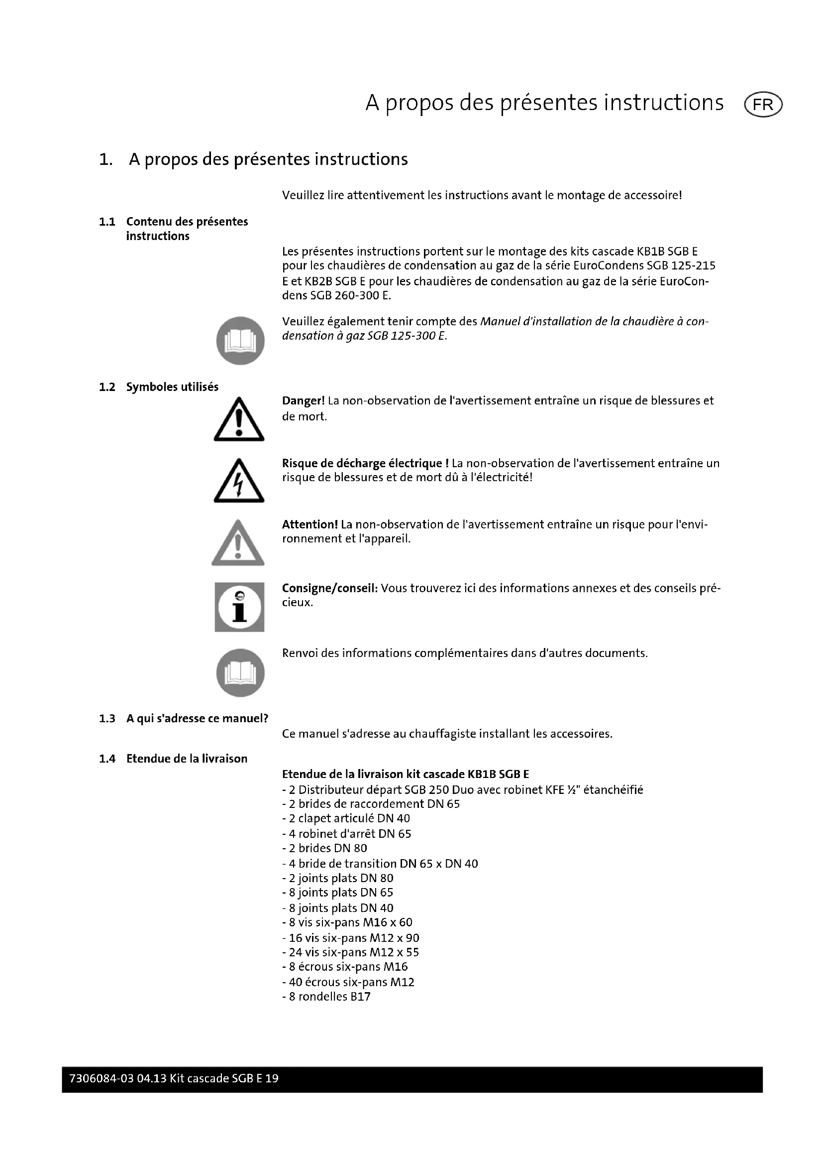 Etendue de la livraison kit cascade KB1B SGB E - 2 Distributeur départ SGB 250 Duo avec robinet KFE ½" étanchéifié - 2 brides de raccordement DN 65 - 2 clapet articulé DN 40 - 4 robinet d'arrêt DN 65 - 2 brides DN 80 - 4 bride de transition DN 65 x DN 40 - 2 joints plats DN 80 - 8 joints plats DN 65 - 8 joints plats DN 40 - 8 vis six-pans M16 x 60 - 16 vis six-pans M12 x 90 - 24 vis six-pans M12 x 55 - 8 écrous six-pans M16 - 40 écrous six-pans M12 - 8 rondelles B17 A propos des présentes instructions 7306084-03 04.13 Kit cascade SGB E 19 FR- 80 rondelles B13 - 4 joints en caoutchouc - Instructions de montage Etendue de la livraison kit cascade KB2B SGB E - 2 Distributeur départ SGB 600 Duo avec robinet KFE ½" étanchéifié - 2 brides de raccordement DN 65 - 2 clapet articulé DN 50 - 4 robinet d'arrêt DN 65 - 2 brides DN 100 - 2 joints plats DN 100 - 6 joints plats DN 65 - 4 joints plats DN 50 - 8 vis six-pans M16 x 60 - 8 vis six-pans M12 x 100 - 40 vis six-pans M12 x 60 - 8 écrous six-pans M16 - 48 écrous six-pans M12 - 16 rondelles B17 - 96 rondelles B13 - 4 joints en caoutchouc - Instructions de montage A propos des présentes instructions 20 Kit cascade SGB E 7306084-03 04.13 FR2. Sécurité Danger! Observez absolument les consignes de sécurité suivantes ! Dans le cas contraire, vous vous exposez, vous et des tiers, à des risques.