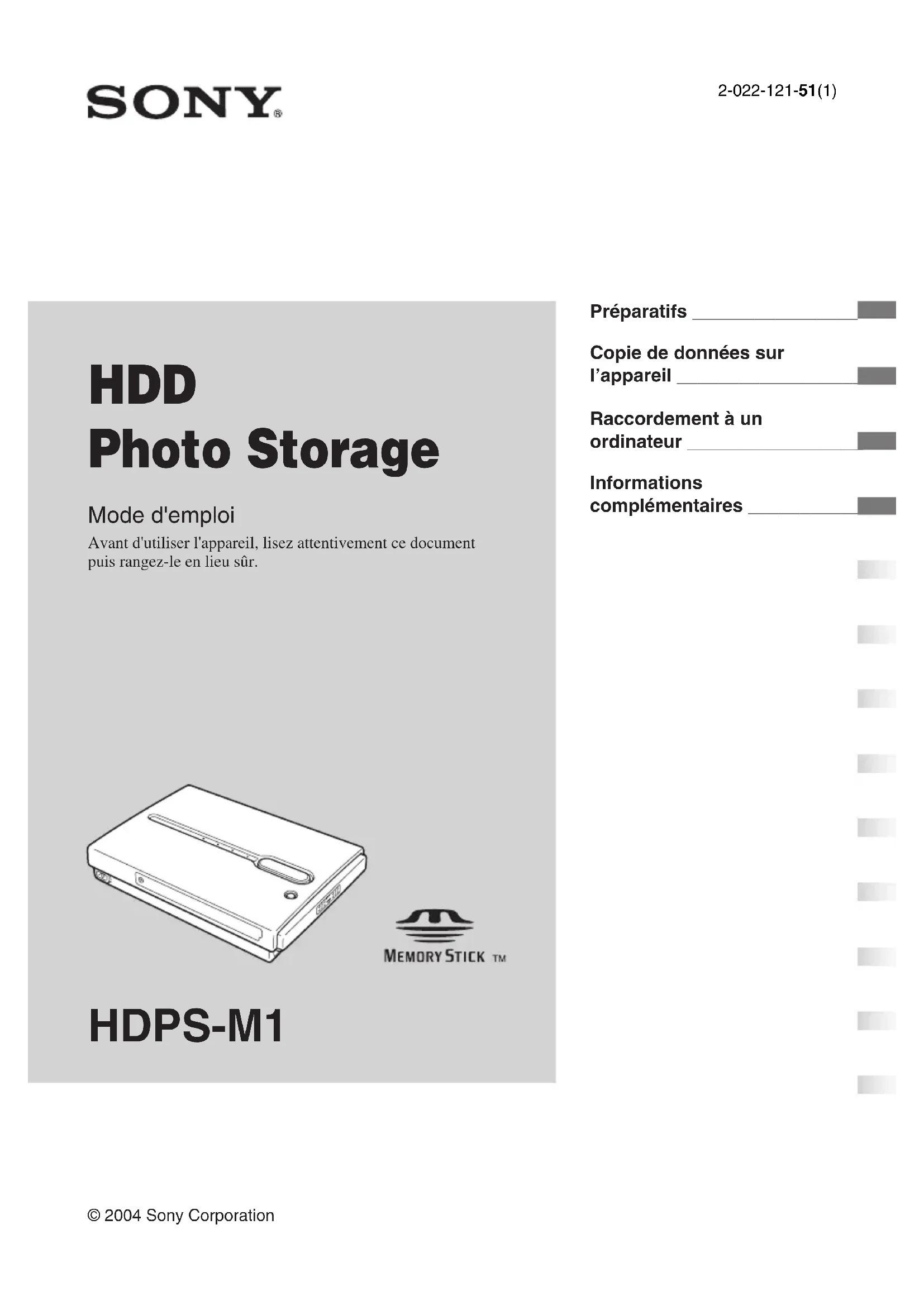 © 2004 Sony Corporation HDPS-M1 OPEN HDD Photo Storage Mode d'emploi Avant d'utiliser l'appareil, lisez attentivement ce document puis rangez-le en lieu sûr. Préparatifs ________________ Copie de données sur l’appareil __________________ Raccordement à un ordinateur _________________ Informations complémentaires ___________ 2-022-121-51(1)2 Consignes de sécurité ATTENTION Ne laissez pas ce produit à portée de jeunes enfants. En cas d’ingestion de n’importe quelle pièce de l’appareil, consultez un médecin sans délai. Pour éviter tout risque d’incendie ou de décharge électrique, n’exposez pas l’appareil à la pluie ou à l’humidité. Pour éviter tout risque de décharge électrique, n’ouvrez pas le boîtier du produit. En cas de besoin, adressez-vous exclusivement à un technicien qualifié. Cet appareil doit être utilisé uniquement avec une alimentation SONY, modèle HDAC-M1/MCS-AC1. Avertissement Sony Corporation n’endosse aucune responsabilité en cas de perte de données stockées sur le disque dur de cet appareil, ou de données copiées sur « Memory Stick » ou carte CompactFlash à l’aide de votre ordinateur.