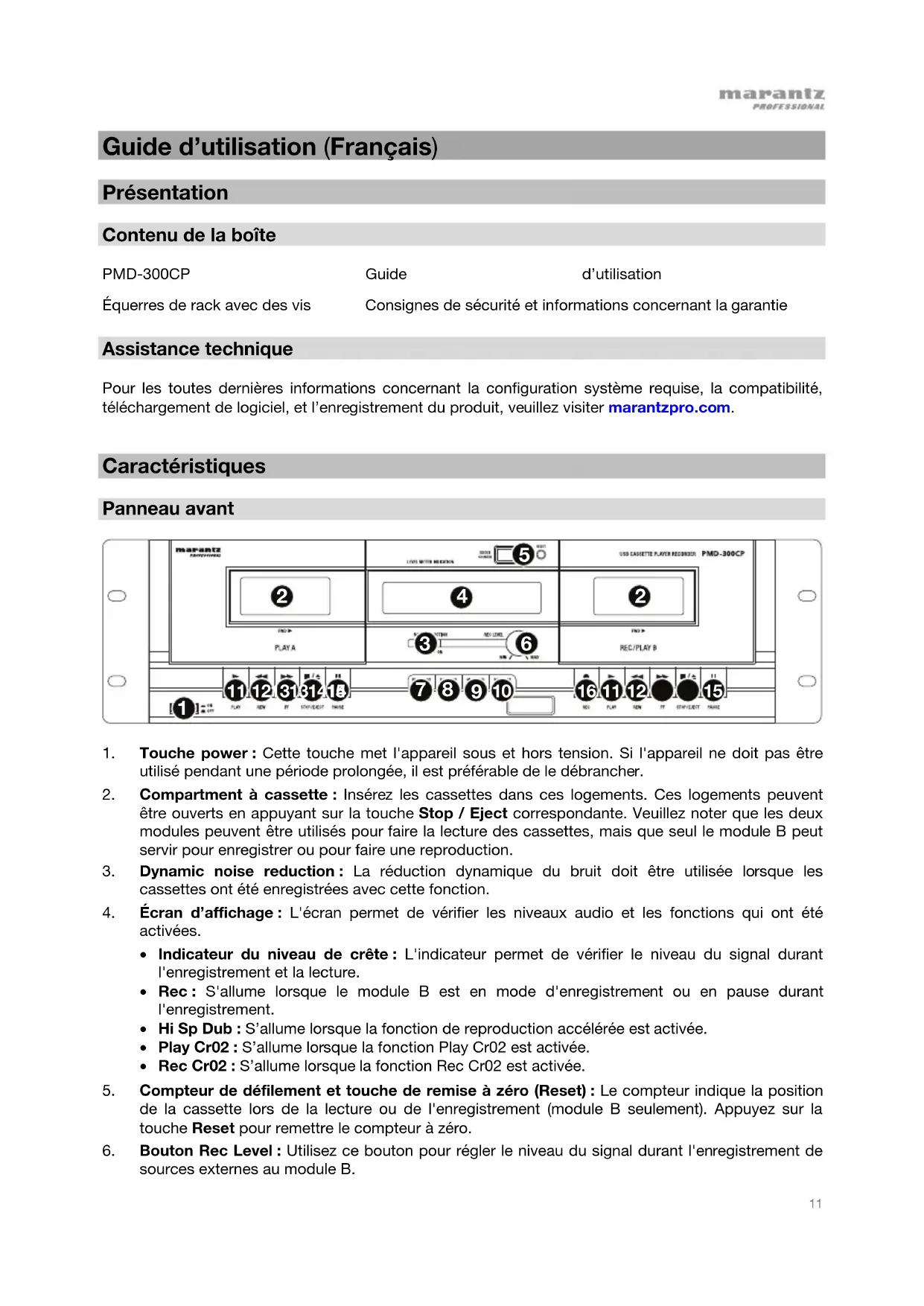 Guide d’utilisation (Français) Présentation Contenu de la boîte PMD-300CP Guide d’utilisation Équerres de rack avec des vis Consignes de sécurité et informations concernant la garantie Assistance technique Pour les toutes dernières informations concernant la configuration système requise, la compatibilité, téléchargement de logiciel, et l’enregistrement du produit, veuillez visiter marantzpro.com.