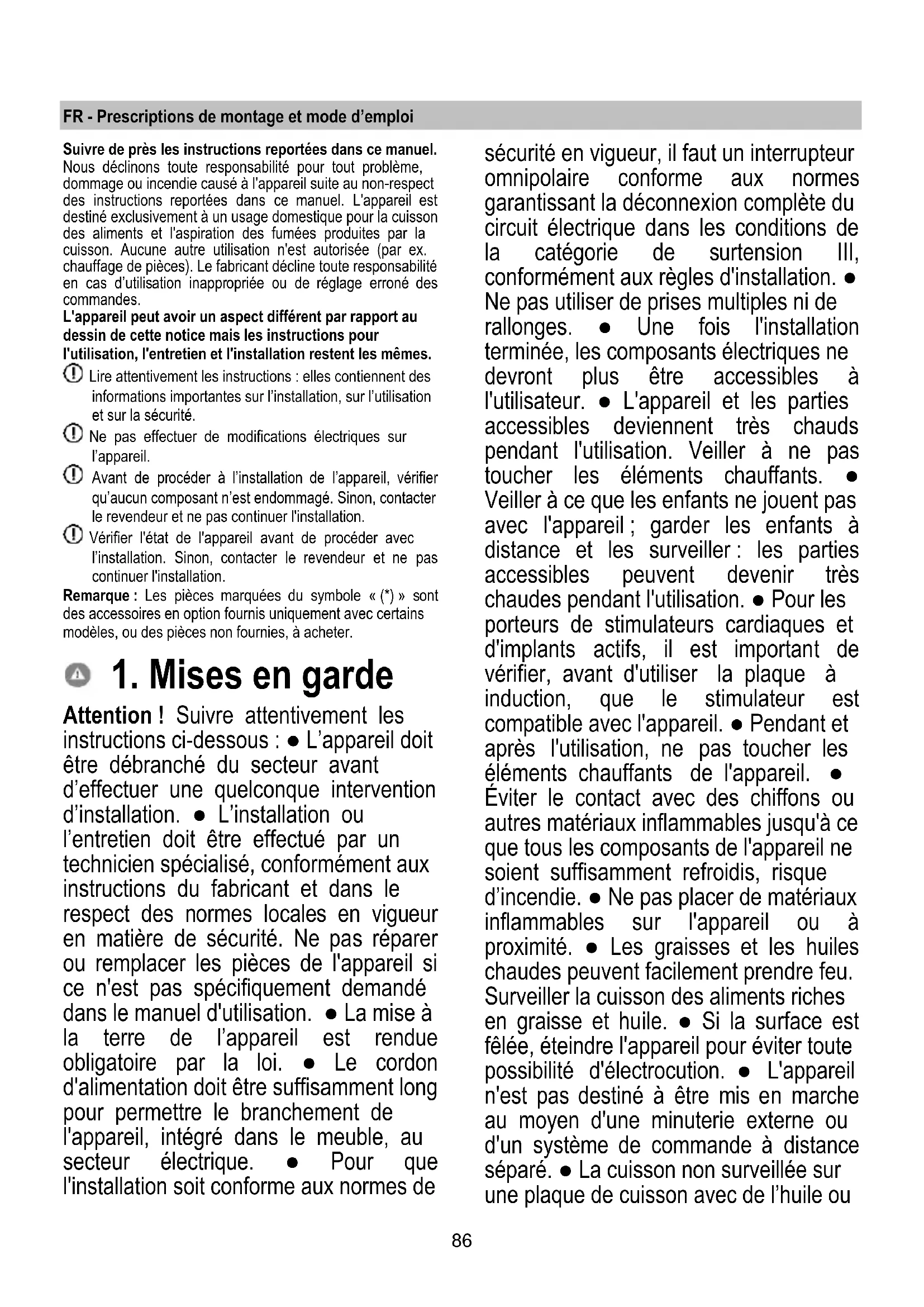 Attention ! Suivre attentivement les instructions ci-dessous : ● L’appareil doit être débranché du secteur avant d’effectuer une quelconque intervention d’installation. ● L’installation ou l’entretien doit être effectué par un technicien spécialisé, conformément aux instructions du fabricant et dans le respect des normes locales en vigueur en matière de sécurité. Ne pas réparer ou remplacer les pièces de l'appareil si ce n'est pas spécifiquement demandé dans le manuel d'utilisation. ● La mise à la terre de l’appareil est rendue obligatoire par la loi. ● Le cordon d'alimentation doit être suffisamment long pour permettre le branchement de l'appareil, intégré dans le meuble, au secteur électrique. ● Pour que l'installation soit conforme aux normes de sécurité en vigueur, il faut un interrupteur omnipolaire conforme aux normes garantissant la déconnexion complète du circuit électrique dans les conditions de la catégorie de surtension III, conformément aux règles d'installation. ● Ne pas utiliser de prises multiples ni de rallonges. ● Une fois l'installation terminée, les composants électriques ne devront plus être accessibles à l'utilisateur. ● L'appareil et les parties accessibles deviennent très chauds pendant l'utilisation. Veiller à ne pas toucher les éléments chauffants. ● Veiller à ce que les enfants ne jouent pas avec l'appareil ; garder les enfants à distance et les surveiller : les parties accessibles peuvent devenir très chaudes pendant l'utilisation. ● Pour les porteurs de stimulateurs cardiaques et d'implants actifs, il est important de vérifier, avant d'utiliser la plaque à induction, que le stimulateur est compatible avec l'appareil. ● Pendant et après l'utilisation, ne pas toucher les éléments chauffants de l'appareil. ● Éviter le contact avec des chiffons ou autres matériaux inflammables jusqu'à ce que tous les composants de l'appareil ne soient suffisamment refroidis, risque d’incendie. ● Ne pas placer de matériaux inflammables sur l'appareil ou à proximité. ● Les graisses et les huiles chaudes peuvent facilement prendre feu. Surveiller la cuisson des aliments riches en graisse et huile. ● Si la surface est fêlée, éteindre l'appareil pour éviter toute possibilité d'électrocution. ● L'appareil n'est pas destiné à être mis en marche au moyen d'une minuterie externe ou d'un système de commande à distance séparé. ● La cuisson non surveillée sur une plaque de cuisson avec de l’huile ou87 de la graisse peut être dangereuse et provoquer des incendies. ● Le processus de cuisson doit être surveillé. Un processus de cuisson à court terme doit être surveillé en permanence. ● Ne JAMAIS essayer d'éteindre les flammes avec de l'eau. Éteindre l'appareil et étouffer les flammes, par exemple avec un couvercle ou une couverture anti-feu. Risque d'incendie : ne pas placer d'objets sur les surfaces de cuisson. ● Ne pas utiliser de nettoyeur vapeur, risque d'électrocution. ● Ne pas poser d’objets métalliques tels que des couteaux, des fourchettes, des cuillères et des couvercles sur la surface de la plaque de cuisson car ils pourraient surchauffer. ● Avant de brancher l’appareil au secteur électrique : contrôler la plaque des données (placée sur la partie inférieure de l’appareil) pour vérifier que la tension et la puissance correspondent à celle du secteur et que la prise est adéquate. En cas de doute, appeler un électricien qualifié. Important : ● Après utilisation, éteindre la plaque de cuisson au moyen du dispositif de commande et ne pas se fier uniquement au détecteur de casseroles. ● Éviter de renverser du liquide ; pour faire bouillir ou chauffer des liquides, réduire l'apport de chaleur. ● Ne pas laisser les éléments chauffants allumés avec des casseroles et des poêles vides, ou encore sans récipients. ● À la fin de la cuisson, éteindre la zone de cuisson correspondante. ● Pour la cuisson, ne jamais utiliser de papier aluminium, et ne jamais poser directement des produits emballés en aluminium. L'aluminium fondrait et endommagerait irrémédiablement votre appareil. ● Ne jamais chauffer une boîte ou une boîte de conserve contenant des aliments sans l'ouvrir : elle pourrait exploser ! Cette mise en garde vaut pour tous les autres types de plaques de cuisson. ● L'utilisation d'une puissance élevée comme la fonction Booster ne convient pas pour le chauffage de liquides tel que l'huile de friture. Une chaleur excessive pourrait être dangereuse. Dans ces cas, il est recommandé d'utiliser une puissance inférieure. ● Les récipients doivent être directement placés sur la plaque de cuisson et être centrés. N'insérer en aucun cas d’autres objets entre la casserole et la plaque de cuisson. ● En cas de températures élevées, l'appareil réduit automatiquement le niveau de puissance des zones de cuisson. ● Avant toute opération de nettoyage ou d'entretien, débrancher l’appareil du réseau électrique en retirant la fiche électrique ou en coupant l'interrupteur général. ● Utiliser des gants de travail pour toutes les opérations d'installation et d'entretien. ● L'appareil peut être utilisé par des enfants de plus de 8 ans et par des personnes aux capacités physiques, sensorielles ou mentales réduites, ou sans l'expérience ni les connaissances nécessaires, à condition d'être surveillés ou d'avoir reçu les instructions relatives à l'utilisation sûre de l'appareil et à la compréhension des risques inhérents. ● Les enfants doivent être contrôlés pour s'assurer qu'ils ne jouent pas avec l'appareil. ● Le nettoyage et l'entretien ne doivent pas être effectués par des enfants sans surveillance. ● La pièce doit être suffisamment aérée quand l’appareil est utilisé simultanément aux autres appareils de combustion au gaz ou autres combustibles. ● L’appareil doit êt