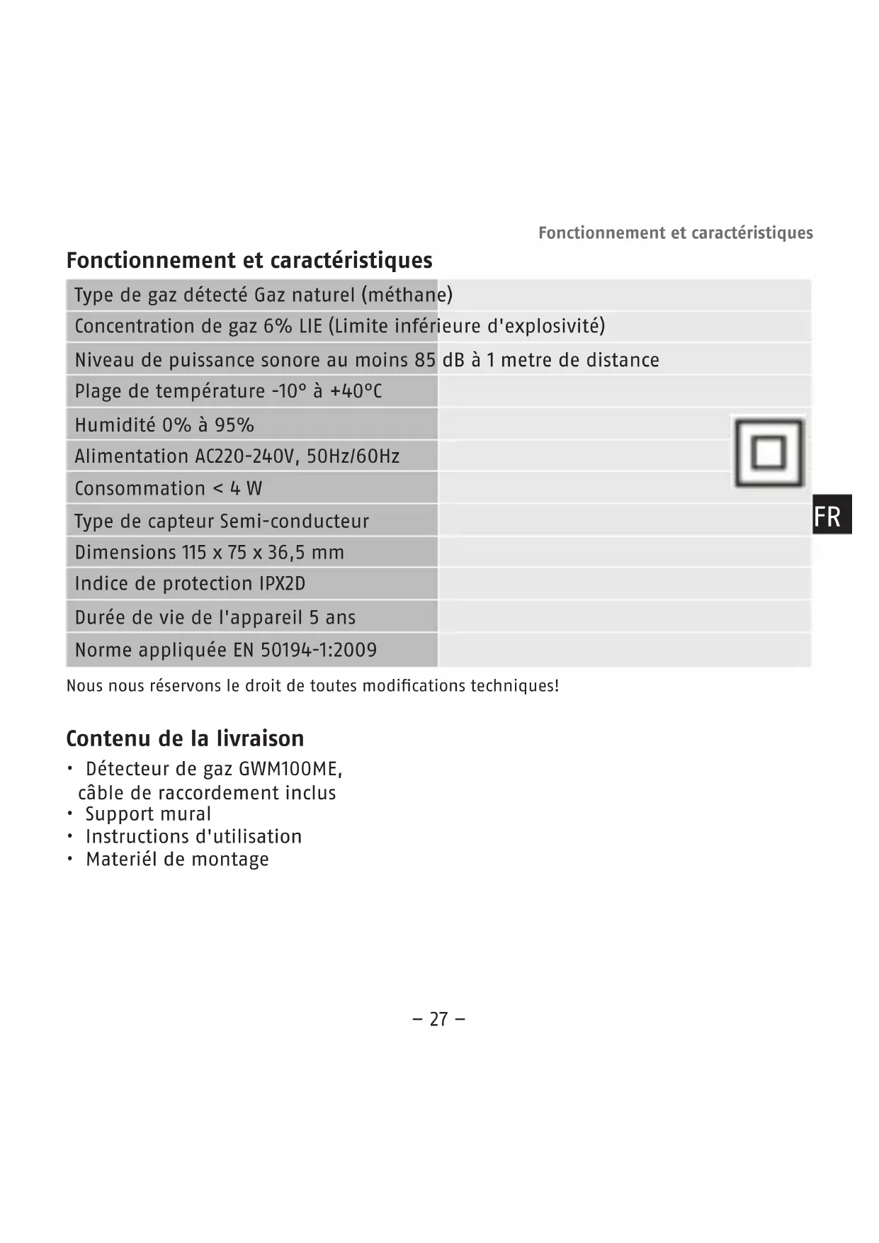 - Materiéldemontage Type de gaz détecté Gaz naturel (méthane) Concentration de gaz 6% LIE (Limite inférieure d'explosivité) Niveau de puissance sonore au moins 85 dB à 1 metre de distance Plage de température -10° à +40°C Humidité 0% à 95% Alimentation AC220-240V, 50Hz/60Hz Consommation <4W Type de capteur Semi-conducteur Dimensions 115 x 75 x 36,5 mm Indice de protection IPX2D Durée de vie de l'appareil 5 ans Normeappliquée EN 50194-1:2009 Fonctionnement et caractéristiques FR– 28 – Signification des symboles Les symboles ci-dessous sont utilisés dans les instructions: Avertissement