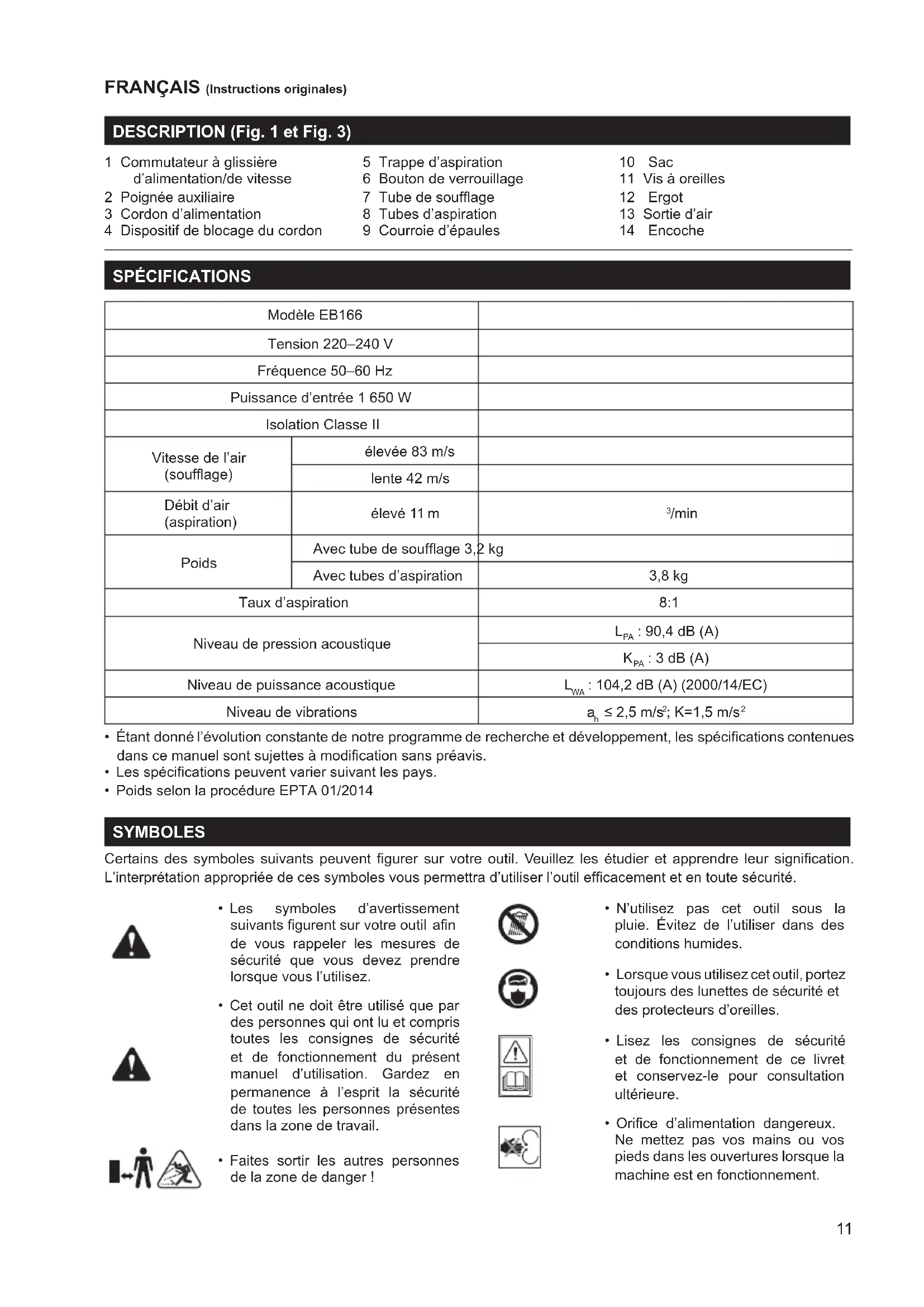 For European countries only The EC declaration of conformity is included as Annex A to this instruction manual.11 FRANÇAIS (Instructions originales) DESCRIPTION (Fig. 1 et Fig. 3) 1 Commutateur à glissière d’alimentation/de vitesse 2 Poignée auxiliaire 3 Cordon d’alimentation 4 Dispositif de blocage du cordon 5 Trappe d’aspiration 6 Bouton de verrouillage 7 Tube de soufage 8 Tubes d’aspiration 9 Courroie d’épaules 10 Sac 11 Vis à oreilles 12 Ergot 13 Sortie d’air 14 Encoche SPÉCIFICATIONS Modèle EB166 Tension 220–240 V Fréquence 50–60 Hz Puissance d’entrée 1 650 W Isolation Classe II Vitesse de l’air (soufage) élevée 83 m/s lente 42 m/s Débit d’air (aspiration) élevé 11 m