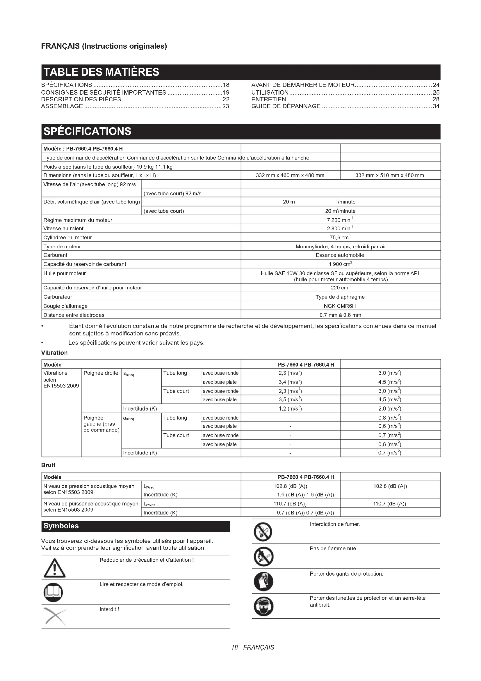 SPÉCIFICATIONS Modèle : PB-7660.4 PB-7660.4 H Type de commande d’accélération Commande d’accélération sur le tube Commande d’accélération à la hanche Poids à sec (sans le tube du soufeur) 10,9 kg 11,1 kg Dimensions (sans le tube du soufeur, L x l x H) 332 mm x 460 mm x 480 mm 332 mm x 510 mm x 480 mm Vitesse de l’air (avec tube long) 92 m/s (avec tube court) 92 m/s Débit volumétrique d’air (avec tube long) 20 m