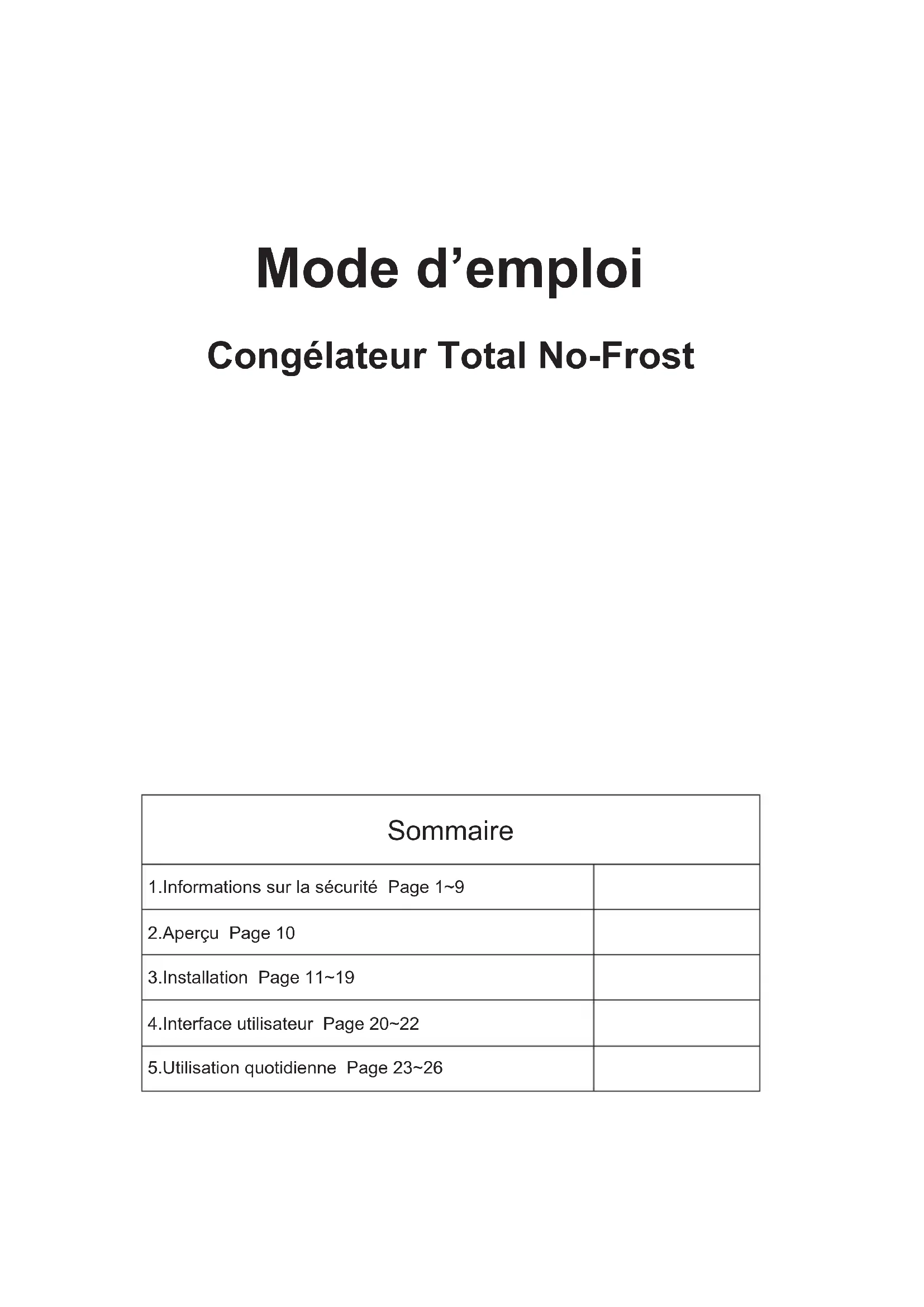 Veuillez lire attentivement les instructions d'utilisation et d'installation ! Elles contiennent des informations importantes sur l'installation, l'utilisation et l'entretien de l'appareil. Le fabricant n'est pas responsable si vous ne respectez pas les instructions et avertissements. Conservez tous les documents pour une utilisation ultérieure ou pour le propriétaire suivant. x Ne branchez pas l’appareil à l'alimentation électrique avant d’avoir retiré tous les protecteurs d'emballage et de transport. Tenez les enfants à l’écart de l'emballage et de ses parties. Risque de suffocation provenant de cartons pliants et de film plastique ! x Laissez-le reposer au moins 4 heures avant de l’allumer pour permettre à l'huile du compresseur de décanter s’il a été transporté horizontalement. x Assurez-vous qu'il n'a pas été endommagé pendant le transport. x N’endommagez pas le circuit réfrigérant. 1x Maintenez les ouvertures de ventilation situées dans le bâti de l'appareil ou sur la structure encastrée, libres de toute obstruction. x N’utilisez jamais de l’eau pour laver le compresseur, essuyez-le avec un chiffon sec après le nettoyage pour éviter la rouille. x Manipulez toujours l'appareil avec au moins deux personnes parce qu'il est lourd. x Installez et mettez à niveau l'appareil dans une zone adaptée à sa taille et à son utilisation. x Assurez-vous que les informations électriques figurant sur la plaque signalétique sont conformes à l'alimentation électrique. Si ce n'est pas le cas, contactez un électricien. x L'appareil est alimenté par une alimentation de 220-240 VCA/50 Hz. Les variations anormales de tension peuvent provoquer l'arrêt de l'appareil ou endommager le régulateur de température ou le compresseur, ou il peut y avoir un bruit anormal lors du fonctionnement. Dans ce cas, un régulateur automatique doit être monté. x Uniquement pour le Royaume-Uni : Le câble d'alimentation de l'appareil est équipé d'une fiche 3 pôles (de mise à la terre) qui s'adapte à une prise standard 3 pôles (de mise à la terre). Ne coupez jamais ou ne démontez jamais la troisième broche (mise à la terre). Une fois l'appareil installé, la fiche doit être accessible. x Assurez-vous que le câble secteur ne se retrouve pas coincé sous l’appareil pendant et après le transport/le déplacement de l'appareil, pour éviter de couper ou d’endommager le câble secteur. Si le cordon d’alimentation est endommagé, faites-le remplacer par le fabricant, 2le service après-vente ou un électricien qualifié pour éviter tout risque d’accident. x Ne pas installer l'appareil dans des endroits humides, huileux ou poussiéreux, ne pas l'exposer à la lumière directe du soleil et à l'eau. x Ne pas installer l'appareil à proximité de radiateurs ou de matériaux inflammables. x POUR les appareils équipés d'un compartiment congélateur : en cas de panne de courant, n’ouvrez pas le couvercle. Les aliments congelés ne devraient pas être affectés si la panne dure moins que les heures indiquées sur l'étiquette signalétique (temps de montée en température). Si la panne dure plus longtemps, alors il convient de vérifier les aliments et de les manger immédiatement ou bien de les cuire et de les congeler à nouveau. x Si vous trouvez que le couvercle de l’appareil est difficile à ouvrir juste après l’avoir fermé, ne soyez pas inquiet. Cela vient de la différence de pression qui doit s'égaliser et permettre au couvercle de s’ouvrir normalement après quelques minutes. x Ne conservez pas de médicaments, de bactéries ou d'agents chimiques dans l'appareil. Cet appareil est un appareil électroménager, il n'est pas recommandé de stocker des produits qui nécessitent des températures strictes. x Ne pas tirer ou plier de manière excessive le cordon d'alimentation ou ne pas toucher la fiche avec les mains mouillées. 3x Ne conservez pas des produits contenant des gaz propulseurs inflammables (par ex. des bombes de pulvérisation) ou des substances explosives dans l'appareil. Risque d'explosion ! x Ne placez pas d'objets instables (objets lourds, récipients remplis d'eau) sur le dessus du réfrigérateur, pour éviter les blessures corporelles causées par une chute ou une électrocution causée par le contact avec de l'eau. x Ne pas utiliser d’appareils électriques à l'intérieur des compartiments de conservation des aliments, sauf s'ils correspondent aux modèles recommandés par le fabricant. x Ne touchez pas les éléments de refroidissement internes, en particulier avec les mains mouillées, afin d’éviter les fissures ou les blessures. x Les enfants, les personnes qui ont des capacités physiques, mentales ou sensorielles limitées, ainsi que les personnes qui ont des connaissances insuffisantes en matière de sécurité d'utilisation de l'appareil sont à risque. x Vérifiez que les enfants et les personnes vulnérables ont compris les dangers. Une personne responsable de la sécurité doit surveiller les enfants et les personnes vulnérables qui utilisent l'appareil ou leur expliquer son fonctionnement. Seuls les enfants âgés de 8 ans et plus peuvent utiliser l'appareil. x Les enfants ne doivent pas jouer avec l'appareil. 4x Les enfants âgés de 3 à 8 ans sont autorisés à remplir et vider cet appareil. x POUR les appareils avec compartiment congélateur : ne conservez pas de liquides en bouteille ou en canette (surtout les boissons gazeuses) dans le compartiment congélateur. Les bouteilles et les canettes peuvent éclater ! x POUR les appareils équipés d'un compartiment congélateur : ne placez jamais d'aliments congelés dans votre bouche juste après les avoir sortis du compartiment congélateur. Risque de brûlures à basse température ! x Gardez les pièces en plastique et le joint de porte exempt d'huile et de graisse. Dans le cas contraire, les pièces en plastique et le joint de porte deviendront poreux. x Av