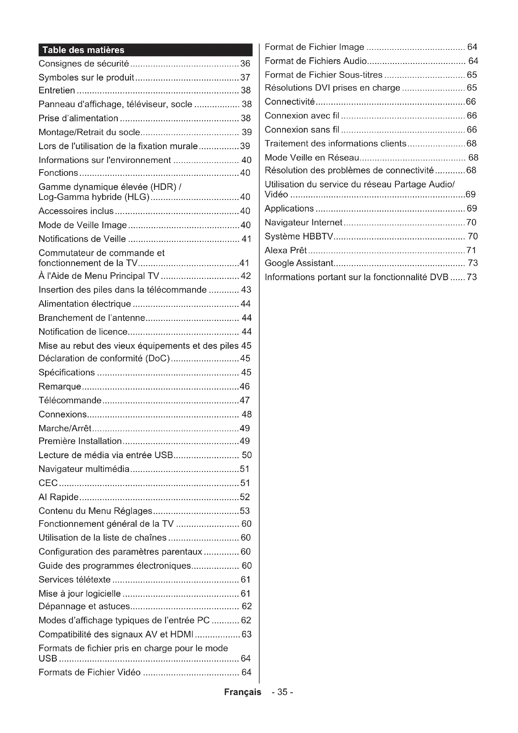 .mkv NIVEAU 1/2, MPEG4, H.264 .flv Sorenson Sp, MPEG4, H.264 .asf, .wmv MPEG4, WMV3, VC1 .webm VP9, VP8 .mp4, .mov, .3gpp, .3gp, .ts,.trp, .tp, .mkv HEVC/H.265 Format de Fichier Image Extension Spécifications Résolution (largeur x hauteur) .jpg .jpeg Point de comparaison 8 192 x 8 192 Progressif 3000 x 3000 .bmp RGB 1/4/8/16/24/32 bit 8 192 x 8 192 RLE 4/8 bit .png Niveau de gris, 24/32 bit par pixel Format entrelacé Progressive Format de Fichiers Audio Extension Formater .mp3 .mp3 .ac3 .ac3 .aac .AAC .wma WMA .amr .AMR-NB, .AMR-WB .wav . MPEG La, .AAC, .PCMFrançais - 65 - Format de Fichier Sous-titres Sous-titres externes Extension Spécifications .ssa Sous-station Alpha .ass Sous-station Alpha avancée .srt Subripper .sub Micro DVD / SubViewer .sub + .idx VOBSub .txt Micro DVD / TMPlayer / MPL2 .mpl MPL2 .smi Sami .jss JACOSUB .ttml TTML .txt / .sub SOUS-TITRAGE DVD .lrc - Sous-titrages internes Extension Spécifications .mkv VOBSub .mkv ASS / SSA / TEXTE dat, mpg, mpeg, vob Sous-titrage DVD .mp4 Sous-titrage DVD, TEXTE Résolutions DVI prises en charge Reportez-vous aux résolutions suivantes au moment de raccorder des périphériques à votre téléviseur à l’aide des câbles convertisseurs DVI (DVI à HDMI - non fournis). 56Hz 60Hz 66Hz 70Hz 72Hz 75Hz 640 x 400 x 640x480 x x x x 800x600 x x x x x 832 x 624 x 1024x768 x x x x x 1152x864 x x x 1 152 x 870 x 1280x768 x x 1360x768 x 1280x960 x x 1280x1024 x x 1400x1050 x x 1440x900 x x 1600x1200 x 1680x1050 x 1920x1080 xFrançais - 66 - Connectivité Connexion avec fil Connexion à un réseau câblé