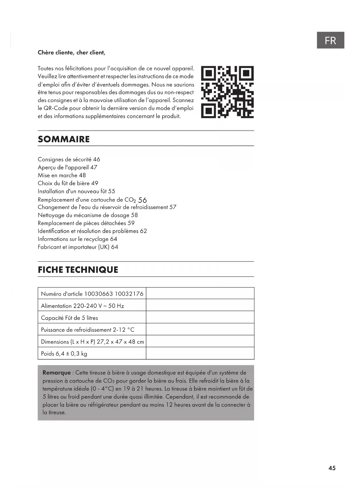 Chère cliente, cher client, Toutes nos félicitations pour l’acquisition de ce nouvel appareil. Veuillez lire attentivement et respecter les instructions de ce mode d’emploi an d’éviter d’éventuels dommages. Nous ne saurions être tenus pour responsables des dommages dus au non-respect des consignes et à la mauvaise utilisation de l’appareil. Scannez le QR-Code pour obtenir la dernière version du mode d‘emploi et des informations supplémentaires concernant le produit. SOMMAIRE Consignes de sécurité46 Aperçu de l'appareil47 Mise en marche48 Choix du fût de bière49 Installation d'un nouveau fût55 Remplacement d'une cartouche de CO ₂56 Changement de l'eau du réservoir de refroidissement57 Nettoyage du mécanisme de dosage58 Remplacement de pièces détachées59 Identication et résolution des problèmes62 Informations sur le recyclage64 Fabricant et importateur (UK)64 FICHE TECHNIQUE Numéro d'article 10030663 10032176 Alimentation 220-240 V ~ 50 Hz Capacité Fût de 5 litres Puissance de refroidissement 2-12 °C Dimensions (L x H x P) 27,2 x 47 x 48 cm Poids 6,4 ± 0,3 kg Remarque : Cette tireuse à bière à usage domestique est équipée d'un système de pression à cartouche de CO₂ pour garder la bière au frais. Elle refroidit la bière à la température idéale (0 - 4°C) en 19 à 21 heures. La tireuse à bière maintient un fût de 5 litres au froid pendant une durée quasi illimitée. Cependant, il est recommandé de placer la bière au réfrigérateur pendant au moins 12 heures avant de la connecter à la tireuse.46