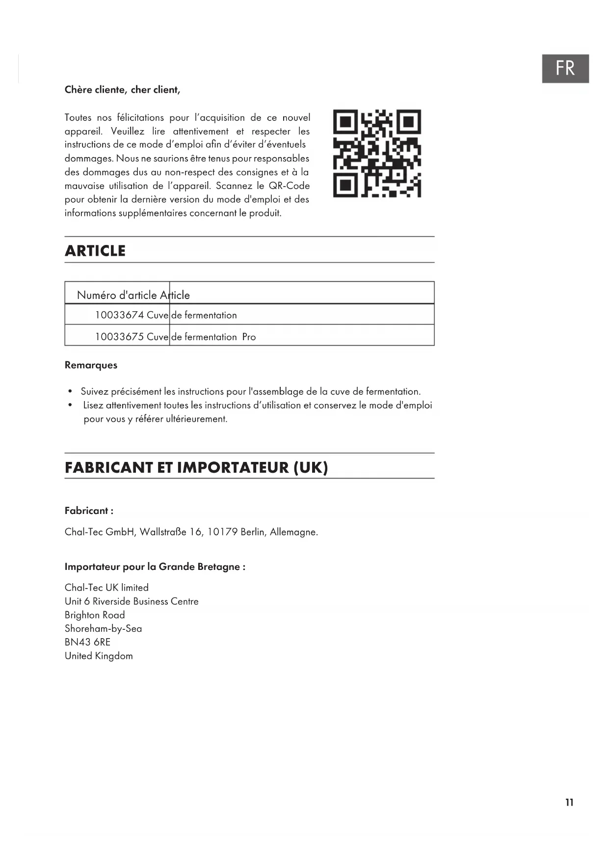 - Lisez attentivement toutes les instructions d’utilisation et conservez le mode d'emploi pour vous y référer ultérieurement. FABRICANT ET IMPORTATEUR (UK) Fabricant : Chal-Tec GmbH, Wallstraße 16, 10179 Berlin, Allemagne. Importateur pour la Grande Bretagne : Chal-Tec UK limited Unit 6 Riverside Business Centre Brighton Road Shoreham-by-Sea BN43 6RE United Kingdom12