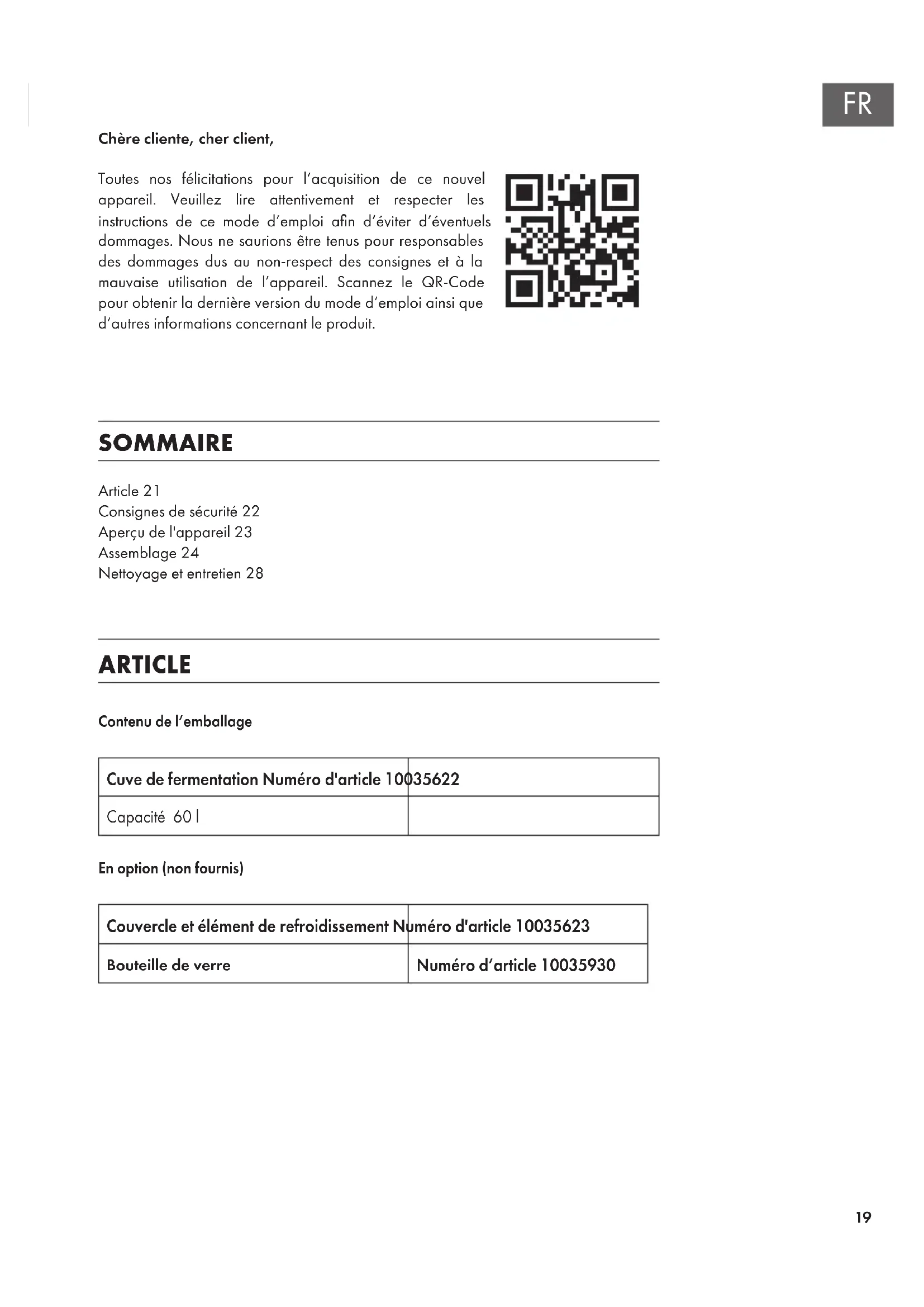 Article 21 Consignes de sécurité 22 Aperçu de l'appareil 23 Assemblage 24 Nettoyage et entretien 28 Chère cliente, cher client, Toutes nos félicitations pour l’acquisition de ce nouvel appareil. Veuillez lire attentivement et respecter les instructions de ce mode d’emploi an d’éviter d’éventuels dommages. Nous ne saurions être tenus pour responsables des dommages dus au non-respect des consignes et à la mauvaise utilisation de l’appareil. Scannez le QR-Code pour obtenir la dernière version du mode d‘emploi ainsi que d‘autres informations concernant le produit. SOMMAIRE ARTICLE Contenu de l’emballage Cuve de fermentation Numéro d'article 10035622 Capacité 60 l En option (non fournis) Couvercle et élément de refroidissement Numéro d'article 10035623 Bouteille de verre Numéro d’article 1003593020