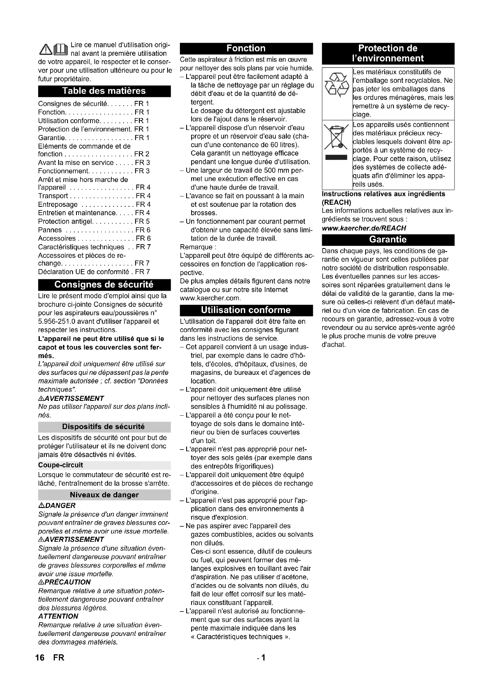 Chairman of the Board of Management Director Regulatory Affairs & Certification 15EN- 1 Lire ce manuel d'utilisation origi- nal avant la première utilisation de votre appareil, le respecter et le conser- ver pour une utilisation ultérieure ou pour le futur propriétaire. Lire le présent mode d'emploi ainsi que la brochure ci-jointe Consignes de sécurité pour les aspirateurs eau/poussières n° 5.956-251.0 avant d'utiliser l'appareil et respecter les instructions. L'appareil ne peut être utilisé que si le capot et tous les couvercles sont fer- més. L'appareil doit uniquement être utilisé sur des surfaces qui ne dépassent pas la pente maximale autorisée ; cf. section "Données techniques". 몇 AVERTISSEMENT Ne pas utiliser l'appareil sur des plans incli- nés. Les dispositifs de sécurité ont pour but de protéger l'utilisateur et ils ne doivent donc jamais être désactivés ni évités. Lorsque le commutateur de sécurité est re- lâché, l'entraînement de la brosse s'arrête. DANGER Signale la présence d'un danger imminent pouvant entraîner de graves blessures cor- porelles et même avoir une issue mortelle. 몇 AVERTISSEMENT Signale la présence d'une situation éven- tuellement dangereuse pouvant entraîner de graves blessures corporelles et même avoir une issue mortelle. 몇 PRÉCAUTION Remarque relative à une situation poten- tiellement dangereuse pouvant entraîner des blessures légères. ATTENTION Remarque relative à une situation éven- tuellement dangereuse pouvant entraîner des dommages matériels. Cette aspirateur à friction est mis en œuvre pour nettoyer des sols plans par voie humide. – L'appareil peut être facilement adapté à la tâche de nettoyage par un réglage du débit d'eau et de la quantité de dé- tergent. Le dosage du détergent est ajustable lors de l'ajout dans le réservoir. – L'appareil dispose d'un réservoir d'eau propre et un réservoir d'eau sale (cha- cun d'une contenance de 60 litres). Cela garantit un nettoyage efficace pendant une longue durée d'utilisation. – Une largeur de travail de 500 mm per- met une exécution effective en cas d'une haute durée de travail. – L'avance se fait en poussant à la main et est soutenue par la rotation des brosses. – Un fonctionnement par courant permet d'obtenir une capacité élevée sans limi- tation de la durée de travail. Remarque : L'appareil peut être équipé de différents ac- cessoires en fonction de l'application res- pective. De plus amples détails figurent dans notre catalogue ou sur notre site Internet www.kaercher.com. L'utilisation de l'appareil doit être faite en conformité avec les consignes figurant dans les instructions de service. – Cet appareil convient à un usage indus- triel, par exemple dans le cadre d'hô- tels, d'écoles, d'hôpitaux, d'usines, de magasins, de bureaux et d'agences de location. – L'appareil doit uniquement être utilisé pour nettoyer des surfaces planes non sensibles à l'humidité ni au polissage. – L'appareil a été conçu pour le net- toyage de sols dans le domaine inté- rieur ou bien de surfaces couvertes d'un toit. – L'appareil n'est pas approprié pour net- toyer des sols gelés (par exemple dans des entrepôts frigorifiques) – L'appareil doit uniquement être équipé d'accessoires et de pièces de rechange d'origine. – L'appareil n'est pas approprié pour l'ap- plication dans des environnements à risque d'explosion. – Ne pas aspirer avec l'appareil des gazes combustibles, acides ou solvants non dilués. Ces-ci sont essence, dilutif de couleurs ou fuel, qui peuvent former des mé- langes explosives en touillant avec l'air d'aspiration. Ne pas utiliser d’acétone, d’acides ou de solvants non dilués, du fait de leur effet corrosif sur les maté- riaux constituant l’appareil. – L'appareil n'est autorisé au fonctionne- ment que sur des surfaces ayant la pente maximale indiquée dans les « Caractéristiques techniques ». Instructions relatives aux ingrédients (REACH) Les informations actuelles relatives aux in- grédients se trouvent sous : www.kaercher.de/REACH Dans chaque pays, les conditions de ga- rantie en vigueur sont celles publiées par notre société de distribution responsable. Les éventuelles pannes sur les acces- soires sont réparées gratuitement dans le délai de validité de la garantie, dans la me- sure où celles-ci relèvent d'un défaut maté- riel ou d'un vice de fabrication. En cas de recours en garantie, adressez-vous à votre revendeur ou au service après-vente agréé le plus proche munis de votre preuve d'achat. Table des matières Consignes de sécurité... FR 1 Fonction... FR 1 Utilisation conforme... FR 1 Protection de l’environnement. FR 1 Garantie... FR 1 Eléments de commande et de fonction ... FR 2 Avant la mise en service ... FR 3 Fonctionnement... FR 3 Arrêt et mise hors marche de l'appareil ... FR 4 Transport ... FR 4 Entreposage ... FR 4 Entretien et maintenance... FR 4 Protection antigel... FR 5 Pannes ... FR 6 Accessoires ... FR 6 Caractéristiques techniques ... FR 7 Accessoires et pièces de re- change... FR 7 Déclaration UE de conformité . FR 7 Consignes de sécurité Dispositifs de sécurité Coupe-circuit Niveaux de danger Fonction Utilisation conforme Protection de l’environnement Les matériaux constitutifs de l’emballage sont recyclables. Ne pas jeter les emballages dans les ordures ménagères, mais les remettre à un système de recy- clage. Les appareils usés contiennent des matériaux précieux recy- clables lesquels doivent être ap- portés à un système de recy- clage. Pour cette raison, utilisez des systèmes de collecte adé- quats afin d'éliminer les appa- reils usés. Garantie 16 FR- 2 1 Crible à peluches 2 Coupe-circuit 3 Flexible de vidange de l'eau sale avec dispositif de dosage 4 Rail de maintien pour la base fixe 5 Flotteur 6 Réservoir d'eau propre 7 Fermeture du réservoir d'eau propre 8 Trou de poignée 9 Tête de nettoy
