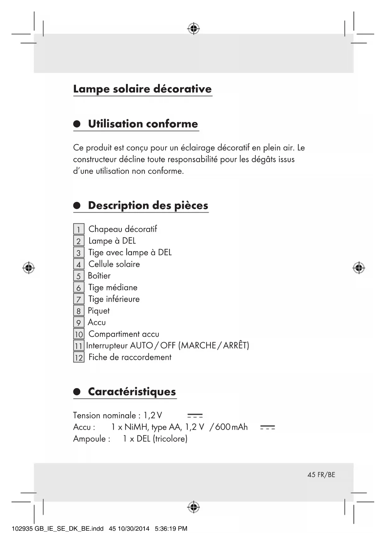 Contenu de livraison Contrôlez immédiatement après le déballage le contenu de livraison en ce qui concerne l‘intégralité du contenu de livraison, ainsi que l‘état irréprochage du produit et de toutes ses pièces. N‘assemblez en aucun cas le produit, si le contenu de livraison ne devait pas être complet. 1 Chapeau décoratif 1 Tige inférieure 1 Fiche de raccordement 1 Tige médiane 1 Tige avec lampe à DEL 1 Piquet 1 Accu, NiMH, type AA, 1,2 V / 600 mAh 1 Mode d’emploi Instructions de sécurité Les droits de recours en garantie sont annulés en cas de dommages résultant du non respect du présent mode d’emploi ! Il n’est assumé ni garantie ni responsabilité pour les dommages consécutifs ! Il n’est 102935 GB_IE_SE_DK_BE.indd 46 10/30/2014 5:36:19 PM47 FR/BE assumé ni garantie ni responsabilité pour les dommages matériels ou corporels causés par une manipulation erronée ou le non respect des instructions de sécurité !