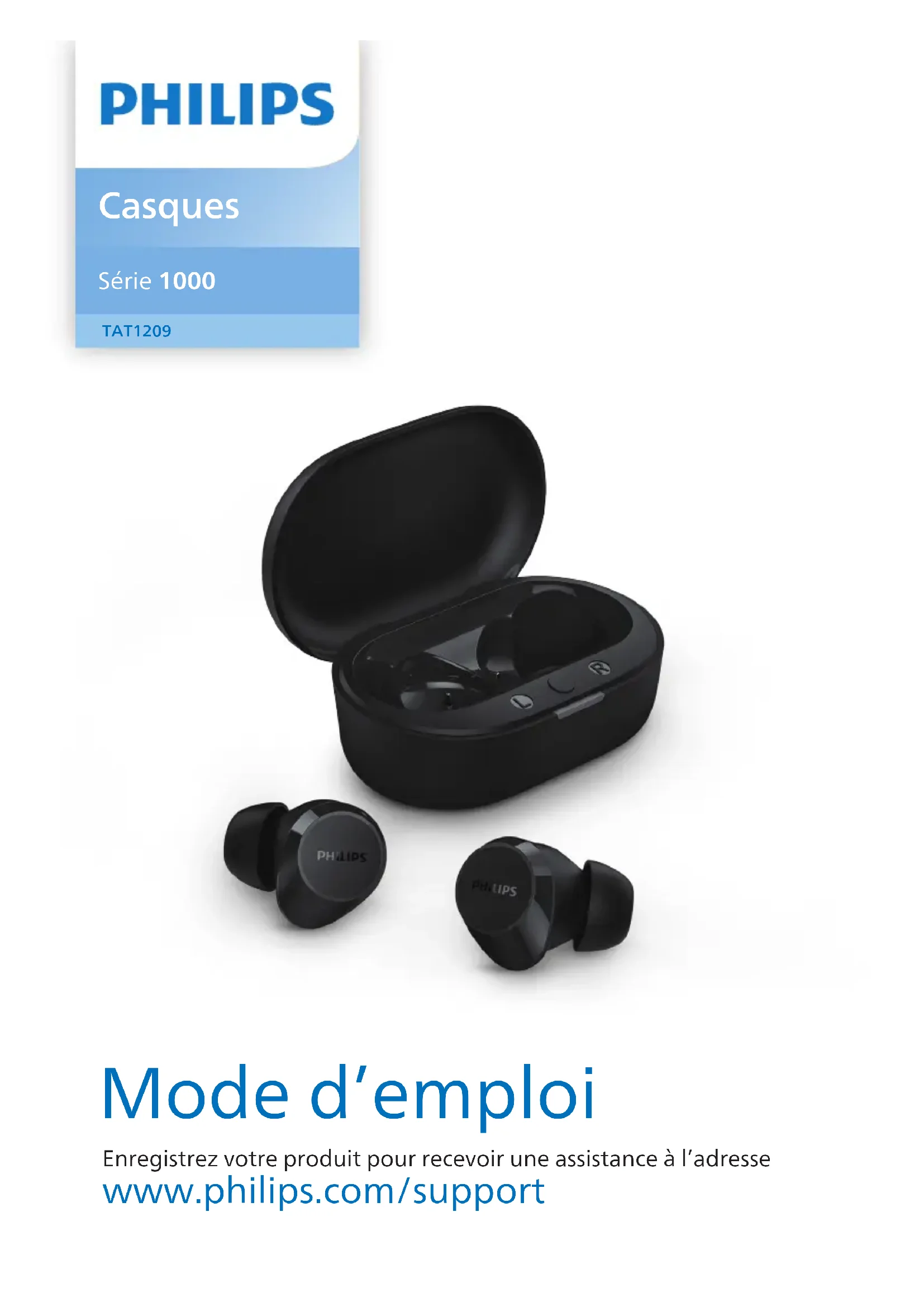 Mode d’emploi Enregistrez votre produit pour recevoir une assistance à l’adresse www.philips.com/support Casques Série1000 TAT12091 Instructions de sécurité importantes 2 Sécurité auditive 2 Informations générales 2 2 Vos oreillettes True Wireless 4 Contenu de la boîte 4 Autres appareils 4 Aperçu de vos oreillettes True Wireless 5 3 Mise en route 6 Recharger la batterie 6 Comment les porter 7 Appairez les oreillettes à votre appareil Bluetooth pour la première fois 7 Appairez les oreillettes avec un autre appareil Bluetooth 8 4 Utilisation de vos oreillettes 9 Connexion des oreillettes à votre appareil Bluetooth 9 Mise sous tension/hors tension 9 Gestion de vos appels et de votre musique 9 Assistant vocal 10 Mode jeu (mode à faible latence) 10 État du voyant LED des oreillettes 10 État du voyant LED de l’étui de charge 10 5 Réinitialisation des oreillettes 11 6 Données techniques 11 7 Avis 12 Déclaration de conformité 12 Mise au rebut de votre ancien produit et de vos piles 12 Retrait de la batterie intégrée 12 Informations environnementales 13 Avis de conformité 13 8 Marques commerciales 15 9 Foire aux questions 16 Tables des matièresFR2 1 Instructions de sécurité importantes Sécurité auditive Danger
