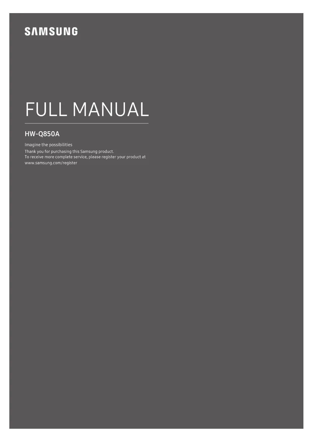 Web Site CANADA 1-800-SAMSUNG(726-7864) 1-844-SAM-PAYS (726-7297) www.samsung.com/ca/support (English) www.samsung.com/ca_fr/support (French) U.S.A 1-800-SAMSUNG (726-7864) 1-844-SAM-PAYS (726-7297) www.samsung.com/us/supportMANUEL COMPLET HW-Q850A Imaginez les possibilités Nous vous remercions d’avoir fait l’acquisition de ce produit Samsung. Pour bénécier d’un service plus complet, veuillez inscrire votre produit sur le site www.samsung.com/registerFRA - 2