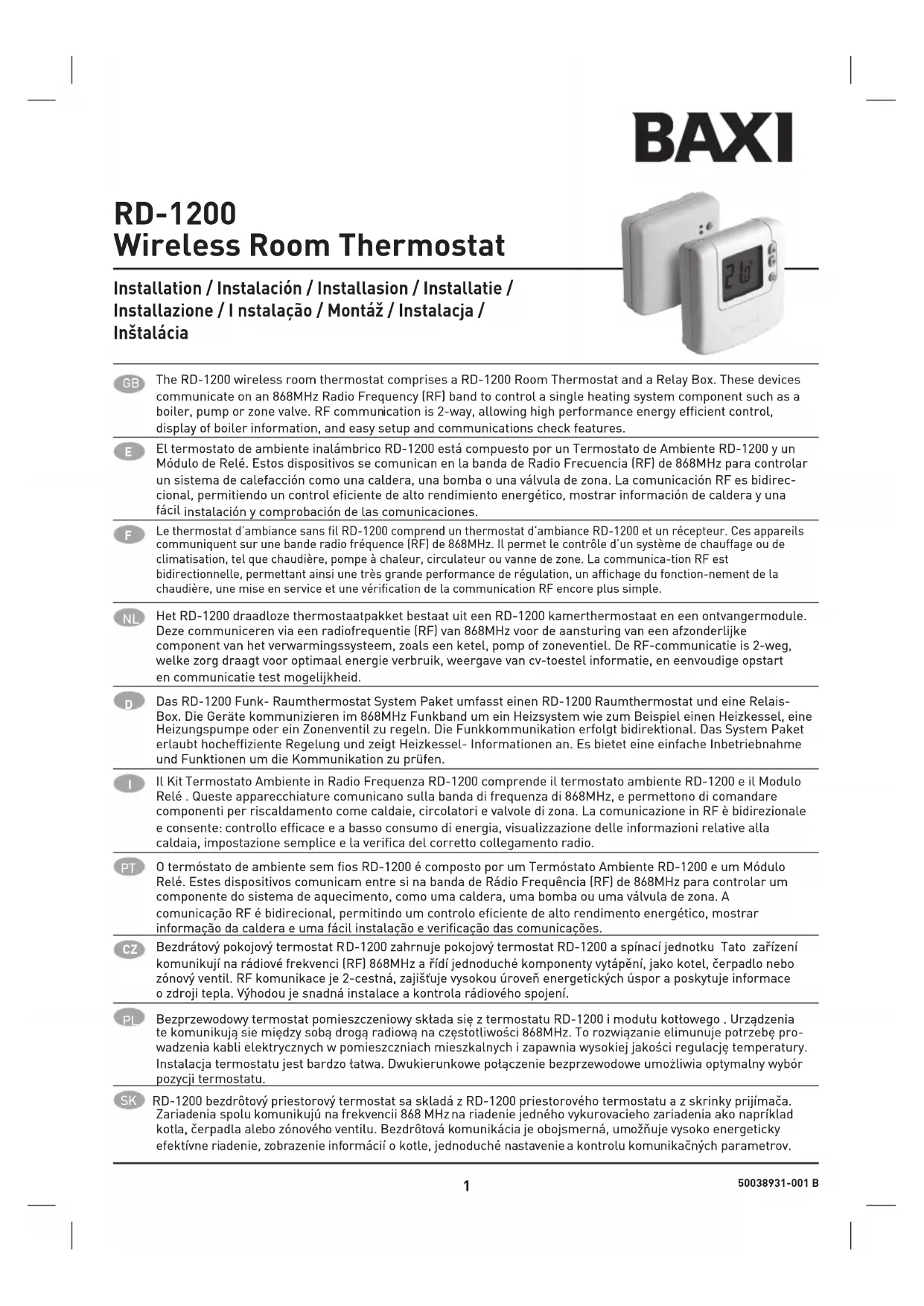 Le thermostat d’ambiance sans fil RD-1200 comprend un thermostat d’ambiance RD-1200 et un récepteur. Ces appareils communiquent sur une bande radio fréquence (RF) de 868MHz. Il permet le contrôle d’un système de chauffage ou de climatisation, tel que chaudière, pompe à chaleur, circulateur ou vanne de zone. La communica-tion RF est bidirectionnelle, permettant ainsi une très grande performance de régulation, un affichage du fonction-nement de la chaudière, une mise en service et une vérification de la communication RF encore plus simple.