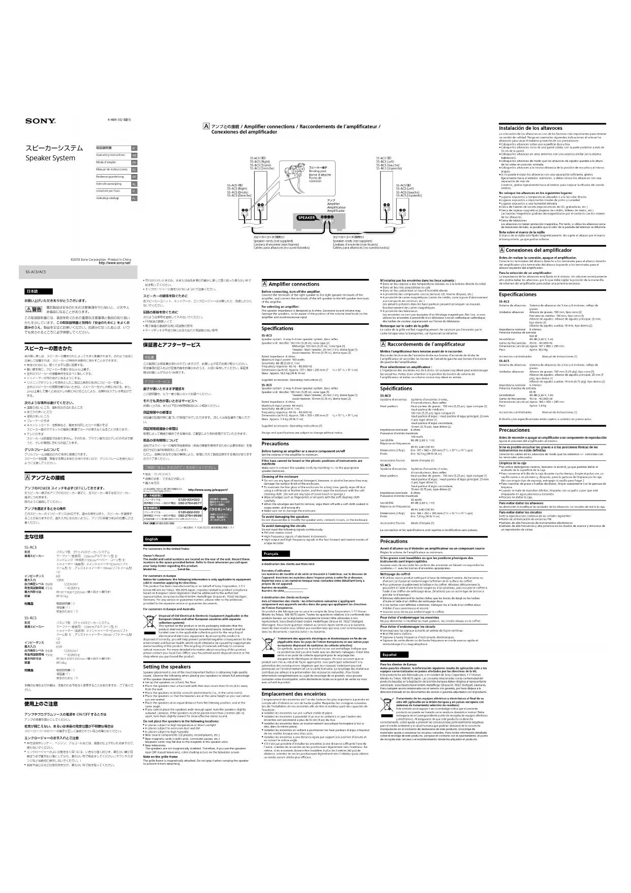 in) Mass Approx. 7.6 kg (16 lb 11 oz)Supplied accessories Operating Instructions (1)Design and specifications are subject to change without notice. Precautions Before turning an amplifier or a source component on/offSet the volume of the amplifier to minimum.If the bass cannot be heard or the phonic positions of instruments are indefiniteMake sure to connect the speaker cords by matching +/– to the appropriate speaker terminals.Cleaning of the enclosure Do not use any type of neutral detergent, benzene, or alcohol because they may damage the surface finish of the enclosure. To maintain the fine gloss of the enclosure for a long time, gently wipe off dust using a soft brush or feather duster, and then wipe the enclosure with the soft cleaning cloth. (Do not use any type of scrub brush or sponge.) Wipe smudges such as fingerprints or oil spots with the soft cleaning cloth carefully. When the smudges are hard to remove, wipe them off with a soft cloth soaked in soapy water, and wrung dry. Make sure not to damage the enclosure.To avoid damaging the speakersDo not disassemble or modify the speaker units, network circuits, or the enclosure.To avoid damaging the circuitsDo not input the following signals continuously: FM inter-station noise High-frequency signals of electronic instruments High output and high-frequency signals in the fast-forward and rewind modes of a tape recorder Français A destination des clients aux Etats-UnisDonnées d’utilisateur Les numéros de modèle et de série se trouvent à l’extérieur, sur le dessous de l’appareil. Inscrivez ces numéros dans l’espace prévu à cette fin ci-dessous. Reportez-vous à ces numéros lorsque vous contactez votre détaillant Sony à propos de cet appareil. Numéro de modèle ______________ Numéro de série______________A destination des clients en Europe Avis à l’intention des clients : les informations suivantes s’appliquent uniquement aux appareils vendus dans des pays qui appliquent les directives de l’Union Européenne.Ce produit a été fabriqué par ou pour le compte de Sony Corporation, 1-7-1 Konan Minato-ku Tokyo, 108-0075 Japon. Toutes les questions relatives à la conformité des produits basées sur la législation européenne doivent être adressées à son représentant, Sony Deutschland GmbH, Hedelfinger Strasse 61, 70327 Stuttgart, Allemagne. Pour toute question relative au Service Après-Vente ou à la Garantie, merci de bien vouloir vous référer aux coordonnées qui vous sont communiquées dans les documents « Service (SAV) » ou Garantie.Traitement des appareils électriques et électroniques en fin de vie (Applicable dans les pays de l’Union Européenne et aux autres pays européens disposant de systèmes de collecte sélective)Ce symbole, apposé sur le produit ou sur son emballage, indique que ce produit ne doit pas être traité avec les déchets ménagers. Il doit être remis à un point de collecte approprié pour le recyclage des équipements électriques et électroniques. En vous assurant que ce produit sont mis au rebut de façon appropriée, vous participez activement à la prévention des conséquences négatives que leur mauvais traitement pourrait provoquer sur l’environnement et sur la santé humaine. Le recyclage des matériaux contribue par ailleurs à la préservation des ressources naturelles. Pour toute information complémentaire au sujet du recyclage de ce produit, vous pouvez contacter votre municipalité, votre déchetterie locale ou le point de vente où vous avez acheté le produit. Emplacement des enceintes L’emplacement des enceintes est l’un des facteurs les plus importants à prendre en compte afin d’obtenir un son de haute qualité. Respectez les consignes suivantes lors de l’installation de vos enceintes afin de tirer le meilleur parti des capacités de l’enceinte : Installez les enceintes sur une surface stable et plane. Installez les enceintes à proximité d’un mur en veillant à ce que l’arrière des enceintes soit positionné à plus de 10 cm (4 po) du mur. Installez les enceintes dans un environnement acoustique homogène (c’est-à-dire, dans la même pièce). Installez les enceintes en veillant à positionner les haut-parleurs d’aigus à hauteur de vos oreilles lorsque vous êtes assis. Installez les enceintes à une distance égale par rapport à la position d’écoute et en suivant le même angle. S’il n’est pas possible d’installer les enceintes à une distance suffisante l’une de l’autre, orientez les enceintes en les positionnant légèrement vers l’extérieur. De même, si les enceintes doivent être installées à plus de 2 mètres (80 po) de distance, orientez-les en les positionnant légèrement vers l’intérieur pour obtenir un rendu sonore stéréo plus efficace.©2013 Sony Corporation Printed in China