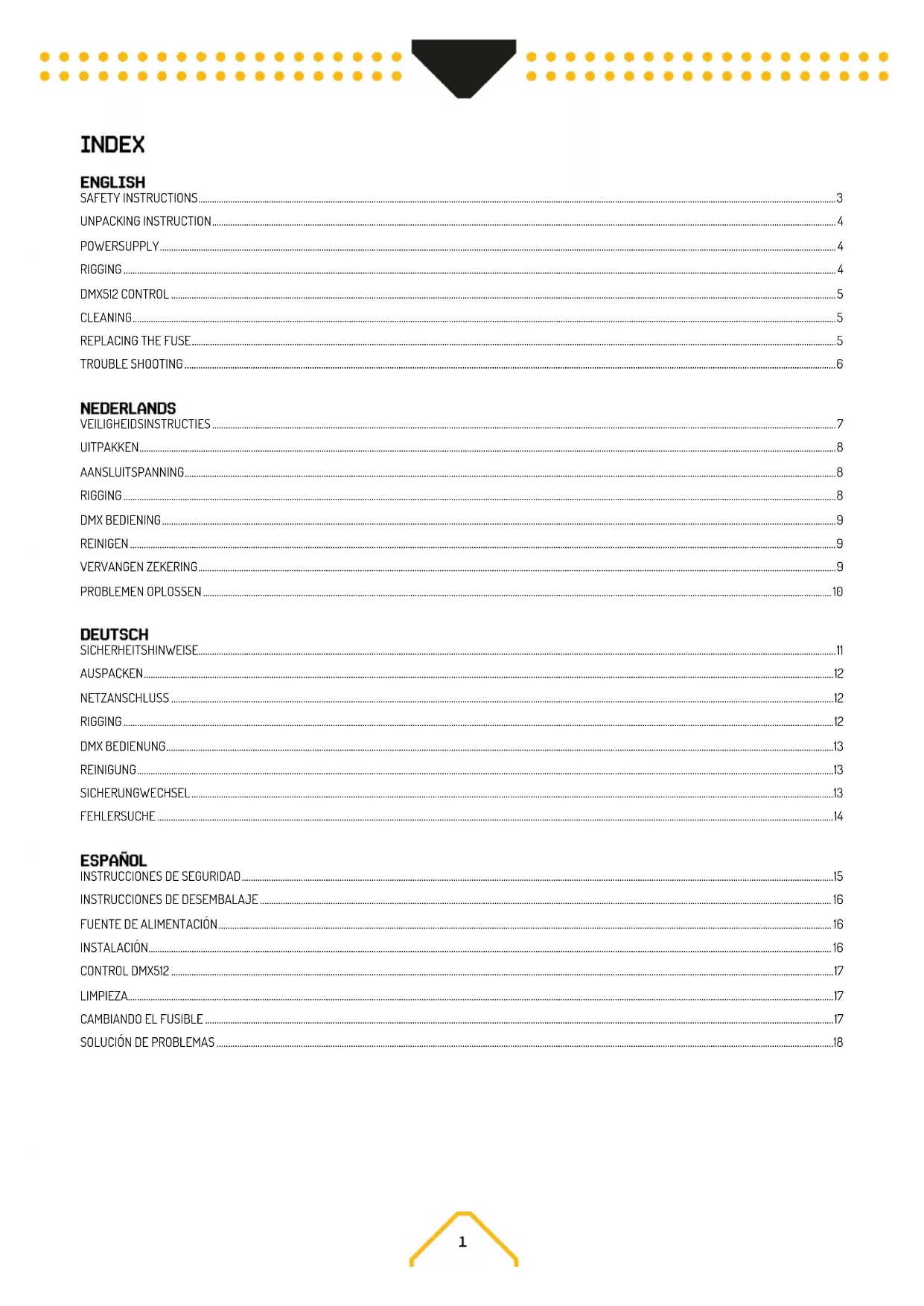 - Séchez le projecteur avec un chiffon doux, propre et non pelucheux ou avec de l'air comprimé basse pression avant de le remettre sous tension.. Si le fusible est défectueux, remplacez-le par un fusible de même type et valeur. Avant de remplacer le fusible, débranchez le cordon secteur. Procédure : Etape 1 : Ouvrez le porte-fusible sur la face arrière avec un tournevis. Etape 2 : Retirez l’ancien fusible du porte-fusible. Etape 3 : Installez le nouveau fusible dans le porte-fusible. Etape 4 : Replacez le porte-fusible dans le boîtier.La liste ci-dessous peut vous aider en cas de problèmes lors de l’utilisation du produit. Pas de réponse de l’appareil. L’appareil n’est pas alimenté. Vérifiez que l’appareil est sous tension. Vérifiez les câbles et branchements. Le fusible a fondu ou problème interne. Remplacer le fusible moyen ou contacter le support Beamz ou un partenaire de service agréé Beamz. N'enlevez pas les couvercles de la base. N'essayez pas de remplacer un fusible ou d'effectuer des réparations ou un entretien qui ne sont pas décrits dans ce manuel d'utilisation à moins d'avoir l'autorisation du support Beamz ou du service autorisé Beamz. L'appareil se réinitialise correctement mais ne répond pas (ou ne répond pas correctement) au contrôleur. Le contrôleur DMX n’est pas relié. Reliez le contrôleur. Mauvaise ligne DMX. Vérifiez les branchements et les câbles. Réparez ou remplacez les câbles défectueux. La ligne DMX n’a pas de résistance terminale. Insérez un bouchon DMX dans la prise de sortie DMX sur le dernier appareil de la ligne DMX. Mauvais adressage de l’appareil. Vérifiez l’adresse de l’appareil et les réglages DMX. Un appareil est défectueux et perturbe la transmission des données dans la ligne DMX. Débranchez les connecteurs DMX IN et OUT et relies-les directement ensemble pour bridger un appareil à la fois jusqu’à ce que le fonctionnement soit rétabli. Faites appel à un technicien qualifié pour réparer l’appareil. Les pins 2 et 3 sont inversés dans la connexion XLR. Vérifiez les câbles et branchements. Installez un câble inversion de phase entre les appareils ou remplacez les broches 2 et 3 dans l’appareil qui se comporte de manière erratique. Erreur après réinitialisation. L’effet nécessite un réglage mécanique. Vérifiez la version du logiciel de l'appareil et les messages d'erreur pour plus d'informations. Contacter le service après-vente Beamz ou un partenaire de service agréé Beamz. Le flux lumineux coupe de manière intermittente. L’appareil est trop chaud. Laisser refroidir l'appareil. Réduire la température ambiante. Veillez à ce que l'air circule librement autour de l'appareil. Nettoyer l'appareil si nécessaire. Les LEDs sont endommagées. Débrancher l'appareil et contacter le service après-vente Beamz ou un partenaire agréé Beamz.. Les réglages de l’alimentation ne correspondent pas à la tension AC et à la fréquence locales. Débranchez l’appareil. Vérifiez les réglages et corrigez si besoin.Przed przystąpieniem do jakichkolwiek czynności związanych z urządzeniem, należy uważnie przeczytać niniejszą instrukcję i zachować ją z lekarstwem na przyszłość. Zawiera ważne informacje dotyczące instalacji, użytkowania i konserwacji urządzenia.
