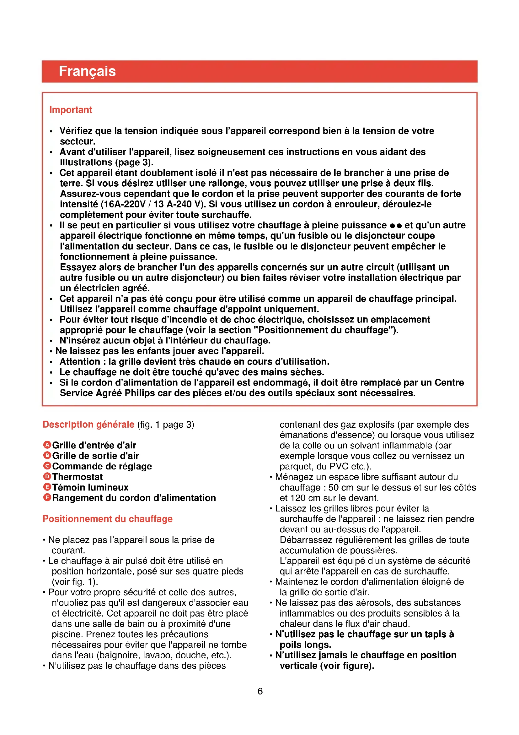 Description générale (fig. 1 page 3) A Grille d'entrée d'air B Grille de sortie d'air C Commande de réglage D Thermostat E Témoin lumineux F Rangement du cordon d'alimentation Positionnement du chauffage