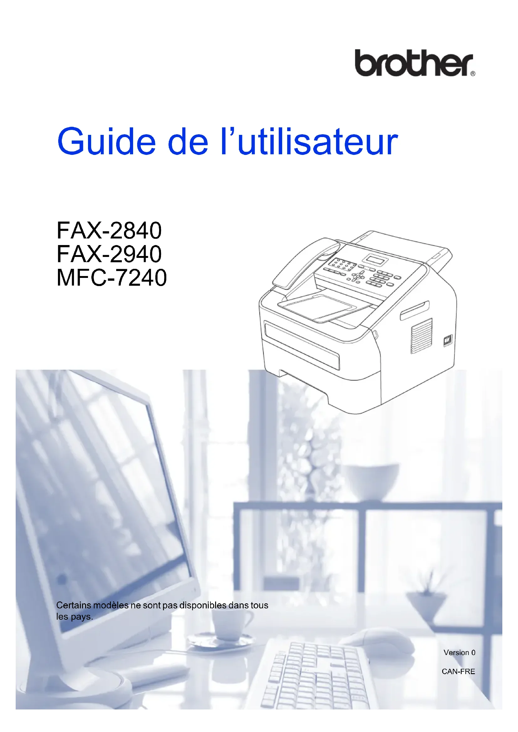 Cordon de ligne téléphonique LG3077001 Guide de l'utilisateur LEA792001 (en anglais pour les États-Unis et le Canada) LEA792002 (en français pour le Canada) Guide d'installation rapide (FAX-2840/FAX-2940) LEA793001 (en anglais pour les États-Unis et le Canada) (MFC-7240) LEA795001 (en anglais pour les États-Unis et le Canada) (FAX-2840/FAX-2940) LEA793002 (en français pour le Canada) (MFC-7240) LEA795002 (en français pour le Canada)iv Avis d'exclusion de garanties (États-Unis et Canada) LE OU LES BAILLEURS DE LICENCES DE BROTHER ET LEURS DIRECTEURS, REPRÉSENTANTS, EMPLOYÉS OU AGENTS (COLLECTIVEMENT DÉSIGNÉS « BAILLEURS DE LICENCES DE BROTHER ») N'ASSURENT AUCUNE GARANTIE, EXPRESSE OU TACITE, Y COMPRIS, MAIS NON DE FAÇON LIMITATIVE, LES GARANTIES TACITES DE QUALITÉ MARCHANDE ET D'APTITUDE À UN USAGE DONNÉ, À L'ÉGARD DU LOGICIEL. LE OU LES BAILLEURS DE LICENCES DE BROTHER N'ASSURENT AUCUNE GARANTIE ET NE FONT AUCUNE DÉCLARATION À L'ÉGARD DE L'UTILISATION OU DES RÉSULTATS DÉCOULANT DE L'UTILISATION DU LOGICIEL POUR CE QUI EST DE L'EXACTITUDE, DE LA FIABILITÉ, DE LA MISE À NIVEAU OU AUTRE DE CE DERNIER. TOUT RISQUE LIÉ AUX RÉSULTATS ET AUX PERFORMANCES DU LOGICIEL EST INTÉGRALEMENT ASSUMÉ PAR VOUS. L'EXCLUSION DES GARANTIES TACITES N'EST PAS AUTORISÉE DANS CERTAINS ÉTATS DES ÉTATS-UNIS OU DANS CERTAINES PROVINCES DU CANADA. L'EXCLUSION CI- DESSUS PEUT NE PAS S'APPLIQUER À VOTRE CAS. EN AUCUN CAS, LE OU LES BAILLEURS DE LICENCES DE BROTHER NE SAURAIENT ÊTRE TENUS RESPONSABLES DES DOMMAGES ACCESSOIRES, ACCIDENTELS OU INDIRECTS (Y COMPRIS LES DOMMAGES-INTÉRÊTS POUR LA PERTE DE BÉNÉFICES, L'INTERRUPTION DES AFFAIRES, LA PERTE D'INFORMATIONS COMMERCIALES OU AUTRE) DÉCOULANT DE L'UTILISATION OU DE L'IMPOSSIBILITÉ D'UTILISER CE LOGICIEL MÊME SI LES BAILLEURS DE LICENCES DE BROTHER ONT ÉTÉ AVISÉS DE LA POSSIBILITÉ DE CES DOMMAGES. CERTAINS ÉTATS DES ÉTATS-UNIS OU CERTAINES PROVINCES DU CANADA N'AUTORISANT PAS L'EXCLUSION OU LA LIMITATION DES RESPONSABILITÉS POUR LES DOMMAGES ACCESSOIRES OU ACCIDENTELS, LES LIMITATIONS CI-DESSUS PEUVENT NE PAS S'APPLIQUER À VOTRE CAS. DANS TOUS LES CAS, LA RESPONSABILITÉ QUE LES BAILLEURS DE LICENCES DE BROTHER ONT ENVERS VOUS À L'ÉGARD DES DOMMAGES RÉELS, QUELLE QU'EN SOIT L'ORIGINE ET QUELLE QUE SOIT LA FORME DE L'ACTION (CONTRAT, TORT (Y COMPRIS LA NÉGLIGENCE), RESPONSABILITÉ DU FAIT DU PRODUIT OU AUTRE), SERA LIMITÉE À50$. Avis de rédaction et de publication Le présent guide décrivant le produit et ses caractéristiques techniques les plus récentes a été rédigé et publié sous la supervision de Brother Industries Ltd. Le contenu du présent guide et les caractéristiques de ce produit peuvent être modifiés sans préavis. La société Brother se réserve le droit d'apporter des modifications sans préavis aux caractéristiques et aux informations contenues dans la documentation. Elle ne saurait être tenue responsable de quelque dommage que ce soit (y compris des dommages consécutifs) résultant de la confiance accordée aux informations présentées, y compris, mais sans limitation, les erreurs typographiques ou autres en rapport avec la publication.v Contenu et emplacement des guides Téléchargez le logiciel en option disponible sur le Centre de solutions Brother (Brother Solutions Center) (utilisateurs FAX-2840 et FAX-2940) Vous pouvez télécharger gratuitement le pilote d'imprimante, le pilote du scanner (FAX-2940 seulement