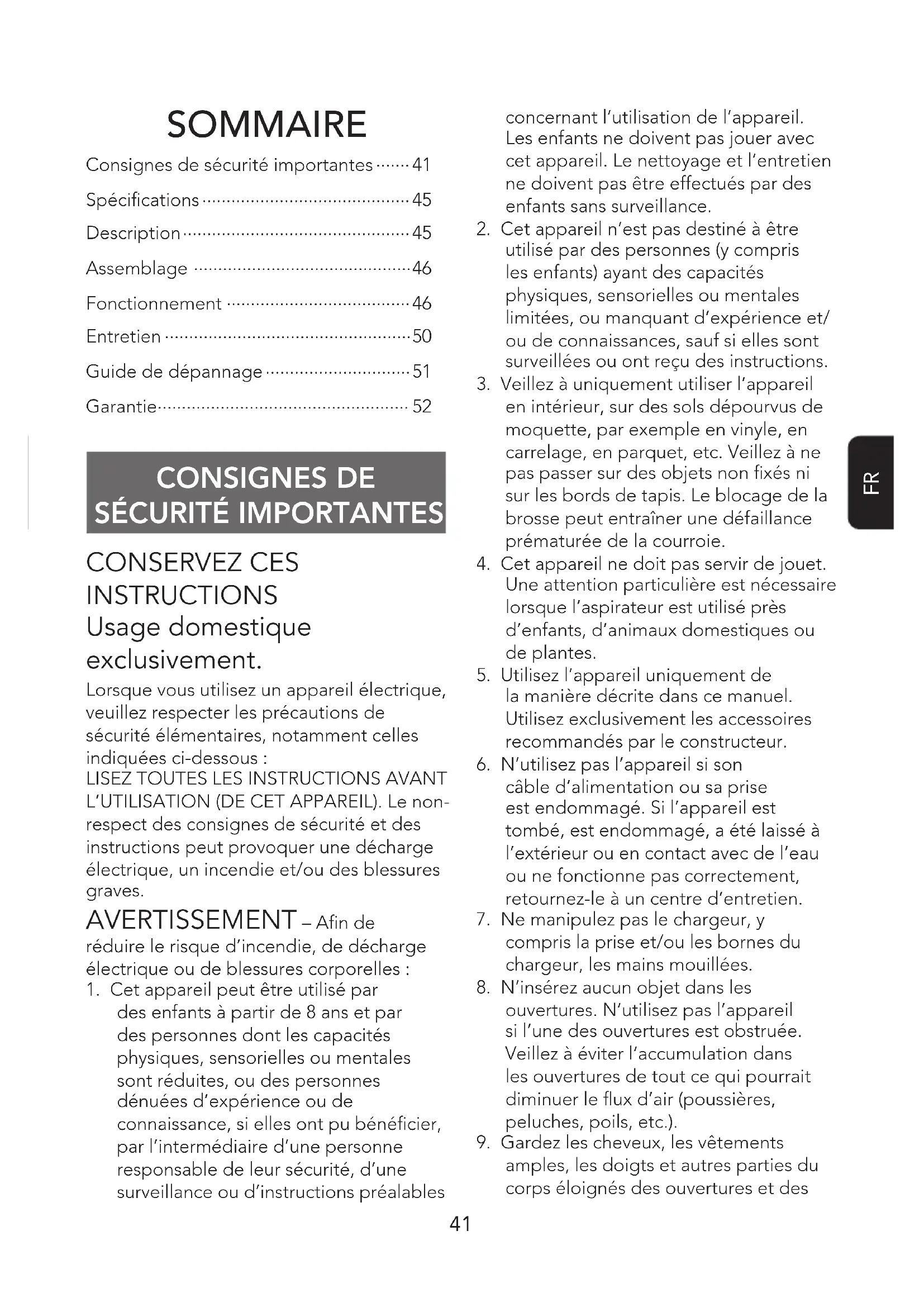 Consignes de sécurité importantes 41 Spécifications 45 Description 45 Assemblage 46 Fonctionnement 46 Entretien 50 Guide de dépannage 51 Garantie 52