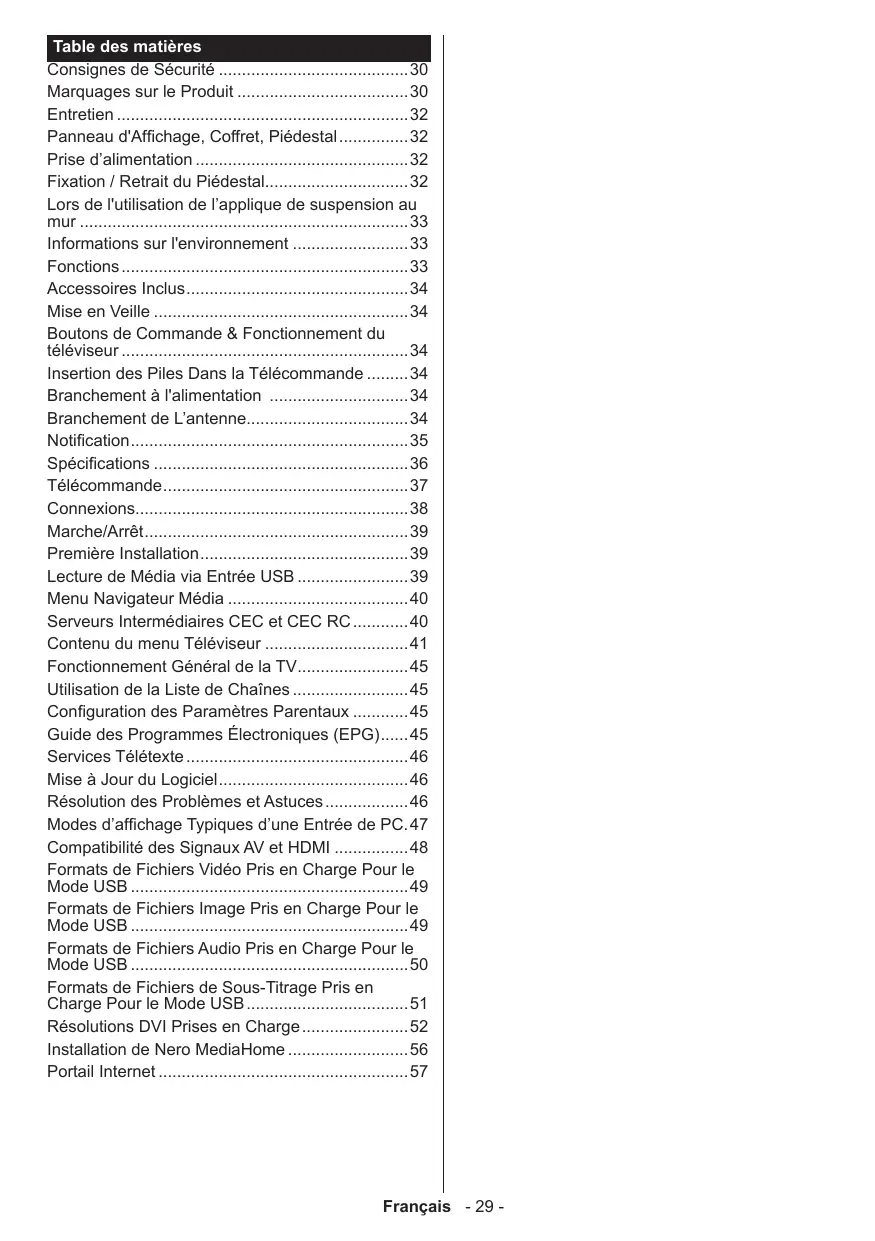 - Portail Internet Français - 29 - Consignes de Sécurité Le fait de faire fonctionner votre téléviseur dans des conditions ambiantes extrêmes peut l’endommager. Pendant des phénomènes météorologiques extrêmes (tempêtes, foudre) et de longues périodes d'inactivité (aller en vacances), débranchez le téléviseur du secteur. La prise d’alimentation est utilisée pour débrancher le téléviseur de l’alimentation secteur et doit donc rester facilement accessible. Ce signal apparaît chaque fois que vous avez besoin d'importantes informations concernant le fonctionnement et l'entretien de l'appareil, contenues dans le manuel fourni. Remarque : Respectez les consignes à l'écran afin d'utiliser les fonctions y relatives. IMPORTANT - Veuillez lire attentivement ces instructions avant d'installer ou de faire fonctionner votre appareil p. 57