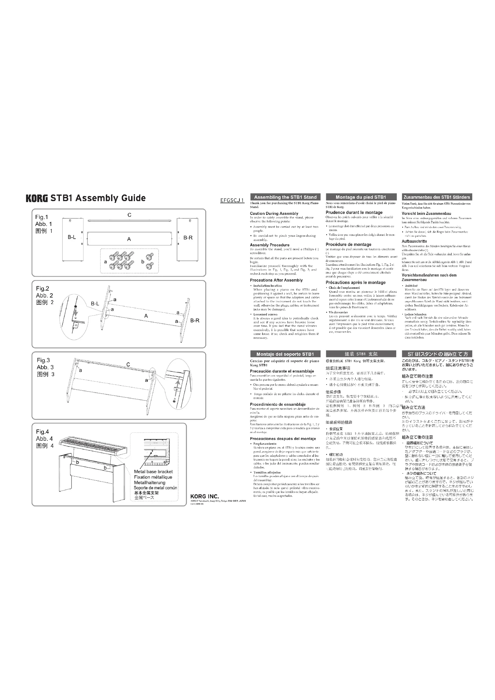 - Choix de l'emplacementQuand vous montez un piano sur le STB1 et placez l'ensemble contre un mur, veillez à laisser susam-ment d'espace entre le mur et l'instrument an de ne pas endommager les câbles, fiches et adaptateurs, voire les prises de l'instrument.• Vis desserréesLes vis peuvent se desserrer avec le temps. Vériez régulièrement si des vis se sont dévissées. Si vous avez l’impression que le pied vibre excessivement, il est possible que des vis soient desserrées. Dans ce cas, resserrez-les. 组装 STB1 支架 感谢您购买 STB1 Korg 钢琴支架支架。组装注意事项为了安全组装支架,请按以下几点操作。• 必须由至少两个人进行组装。• 请小心组装过程中不要夹到手指。 要组装支架,您需要十字花螺丝刀。开始前请确保已准备好所有零件。请根据图例 1、图例 2 和图例 3 的示意图通篇熟悉步骤,并再次检查您要进行的每个步 组装后预防措施• 安装位置将钢琴放在 STB1 上并靠墙固定之后,请确保留出充足的空间以便随机附带的适配器和线缆不会碰到墙,否则可能会损坏插头、线缆或乐器插