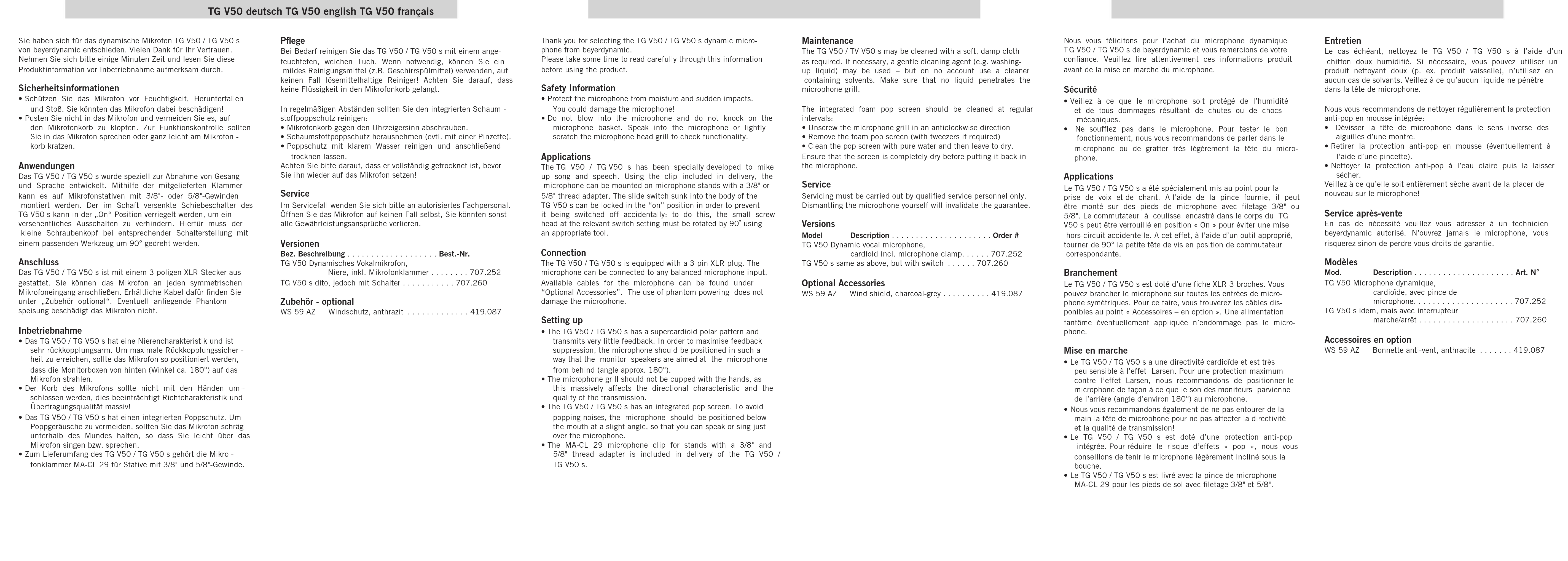 - Nettoyer la protection anti-pop à l’eau claire puis la laisser sécher. Veillez à ce qu’elle soit entièrement sèche avant de la placer de nouveau sur le microphone! Service après-vente En cas de nécessité veuillez vous adresser à un technicien beyerdynamic autorisé. N’ouvrez jamais le microphone, vous risquerez sinon de perdre vous droits de garantie. Modèles Mod. Description . . . . . . . . . . . . . . . . . . . . . Art. N° TG V50 Microphone dynamique, cardioïde, avec pince de microphone. . . . . . . . . . . . . . . . . . . . . 707.252 TG V50 s idem, mais avec interrupteur marche/arrêt . . . . . . . . . . . . . . . . . . . . 707.260 Accessoires en option WS 59 AZ Bonnette anti-vent, anthracite . . . . . . . 419.087TG V50 english TG V50 françaisTG V50 deutsch Technical Specifications Transducer type . . . . . . . . . . . . . . . Dynamic Operating principle . . . . . . . . . . . . . Pressure gradient Polar pattern . . . . . . . . . . . . . . . . . Cardioid Frequency response: Close miking . . . . . . . . . . . . . . . . 50 - 17,000 Hz Distant miking (measured at 1 m). . . 80 - 17,000 Hz Open circuit voltage . . . . . . . . . . . . 2.4 mV/Pa (-52.5 dBV) ±3 dB Nominal impedance . . . . . . . . . . . . 600 Ω Load impedance . . . . . . . . . . . . . . . ≥ 2 kΩ Connection. . . . . . . . . . . . . . . . . . . XLR, 3-pin, male Dimensions: Length . . . . . . . . . . . . . . . . . . . . 167 mm Shaft diameter . . . . . . . . . . . . . . 23/35 mm Head diameter . . . . . . . . . . . . . . 54 mm Weight. . . . . . . . . . . . . . . . . . . . . . 270 g Spécifications techniques Type de transducteur . . . . . . . . . . . Dynamique Principe de fonctionnement. . . . . . . Gradient de pression Directivité . . . . . . . . . . . . . . . . . . . Cardioïde Bande passante: à proximité . . . . . . . . . . . . . . . . . 50 à 17 000 Hz à distance (distance 1 m) . . . . . . 80 à 17 000 Hz Efficacité en champs libre . . . . . . . . 2,4 mV/Pa (-52,5 dBV) ±3 dB Impédance nominale. . . . . . . . . . . . 600 Ω Impédance de charge nom. . . . . . . . ≥ 2 kΩ Connecteur. . . . . . . . . . . . . . . . . . . XLR, 3 broches, mâle Dimensions: Longueur . . . . . . . . . . . . . . . . . . 167 mm Diamètre du corps. . . . . . . . . . . . 23/35 mm Diamètre de la tête . . . . . . . . . . . 54 mm Poids. . . . . . . . . . . . . . . . . . . . . . . 270 g Technische Daten Wandlerprinzip . . . . . . . . . . . . . . . . Dynamisch Arbeitsprinzip. . . . . . . . . . . . . . . . . Druckgradientenempfänger Richtcharakteristik . . . . . . . . . . . . . Niere Übertragungsbereich: Nahfeld . . . . . . . . . . . . . . . . . . . 50 - 17.000 Hz Fernfeld (Entfernung 1 m) . . . . . . 80 - 17.000 Hz Feldleerlaufübertragungsfaktor . . . . . 2,4 mV/Pa (-52,5 dBV) ±3 dB Nennimpedanz . . . . . . . . . . . . . . . . 600 Ω Nennabschlussimpedanz . . . . . . . . . ≥ 2 kΩ Anschluss . . . . . . . . . . . . . . . . . . . XLR, 3-pol., male Abmessungen: Länge. . . . . . . . . . . . . . . . . . . . . 167 mm Schaftdurchmesser . . . . . . . . . . . 23/35 mm Kopfdurchmesser . . . . . . . . . . . . 54 mm Gewicht . . . . . . . . . . . . . . . . . . . . . 270 g +20 +10 0 dB