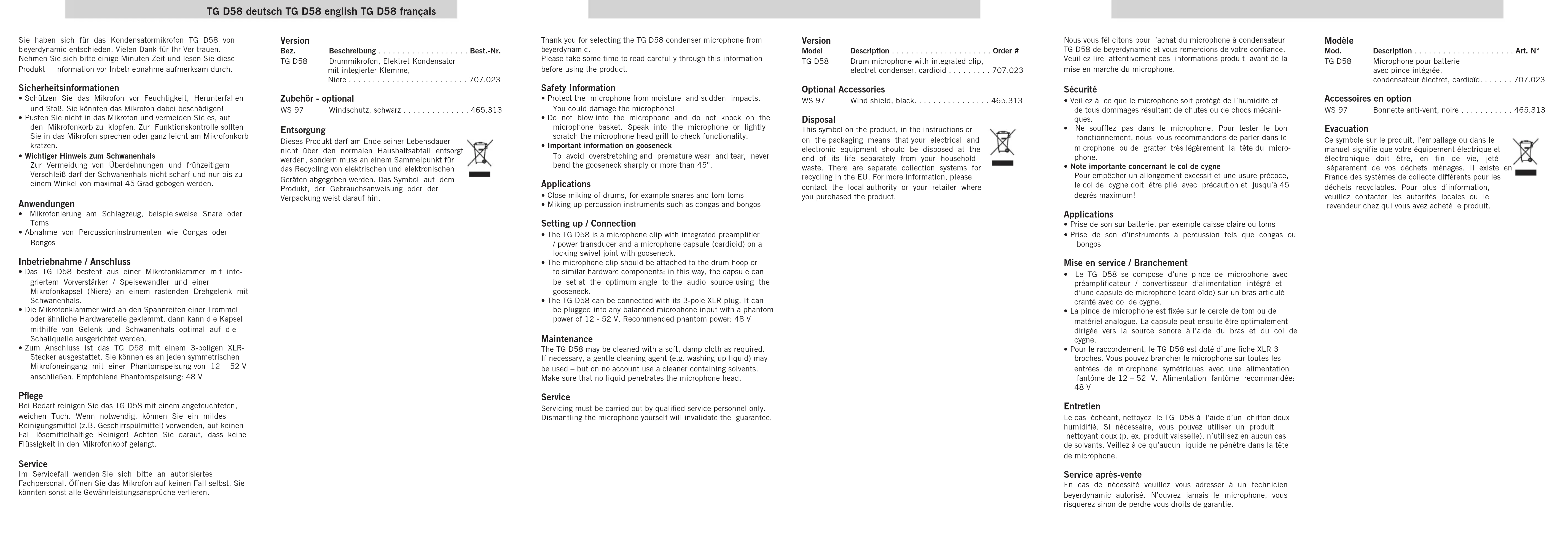 - Pour le raccordement, le TG D58 est doté d’une fiche XLR 3 broches. Vous pouvez brancher le microphone sur toutes les entrées de microphone symétriques avec une alimentation fantôme de 12 – 52 V. Alimentation fantôme recommandée: 48 V Entretien Le cas échéant, nettoyez le TG D58 à l’aide d’un chiffon doux humidifié. Si nécessaire, vous pouvez utiliser un produit nettoyant doux (p. ex. produit vaisselle), n’utilisez en aucun cas de solvants. Veillez à ce qu’aucun liquide ne pénètre dans la tête de microphone. Service après-vente En cas de nécessité veuillez vous adresser à un technicien beyerdynamic autorisé. N’ouvrez jamais le microphone, vous risquerez sinon de perdre vous droits de garantie. Modèle Mod. Description . . . . . . . . . . . . . . . . . . . . . Art. N° TG D58 Microphone pour batterie avec pince intégrée, condensateur électret, cardioïd. . . . . . . 707.023 Accessoires en option WS 97 Bonnette anti-vent, noire . . . . . . . . . . . 465.313 Evacuation Ce symbole sur le produit, l’emballage ou dans le manuel signifie que votre équipement électrique et électronique doit être, en fin de vie, jeté séparement de vos déchets ménages. Il existe en France des systèmes de collecte différents pour les déchets recyclables. Pour plus d’information, veuillez contacter les autorités locales ou le revendeur chez qui vous avez acheté le produit.TG D58 english TG D58 françaisTG D58 deutsch Technical Specifications Transducer type . . . . . . . . . . . . . . . Condenser (back electret) Operating principle . . . . . . . . . . . . . Pressure gradient Polar pattern . . . . . . . . . . . . . . . . . Cardioid Frequency response: Close miking . . . . . . . . . . . . . . . . 20 - 20,000 Hz Distant miking (measured at 1 m). . 35 - 20,000 Hz Open circuit voltage . . . . . . . . . . . . 5 mV/Pa (-46 dBV) ±2.5 dB Nominal impedance . . . . . . . . . . . . 200 Ω Load impedance . . . . . . . . . . . . . . . ≥ 1 kΩ Max. SPL at 24 V and 48 V phantom power . . . 140 dB S/N ratio . . . . . . . . . . . . . . . . . . . . 59 dB [CCIR; Q-Peak] 70 dB [A; RMS] Equivalent SPL. . . . . . . . . . . . . . . . 35 dB [CCIR; Q-Peak] 24 dB [A; RMS] Power supply . . . . . . . . . . . . . . . . . Phantom power: P12; P24; P48 (recommended: 48 V) Power consumption. . . . . . . . . . . . . 4.7 mA Connection. . . . . . . . . . . . . . . . . . . XLR, 3-pin, male Dimensions: Clamp (W x H) . . . . . . . . . . . . . . 85 x 118 mm Gooseneck length . . . . . . . . . . . . 20 mm Weight. . . . . . . . . . . . . . . . . . . . . . approx. 140 g Spécifications techniques Type de transducteur . . . . . . . . . . . Condensateur (back électret) Principe de travail . . . . . . . . . . . . . Gradient de pression Directivité . . . . . . . . . . . . . . . . . . . Cardioïde Bande passante: à proximité . . . . . . . . . . . . . . . . . 20 à 20 000 Hz à distance (distance 1 m) . . . . . . 35 à 20 000 Hz Efficacité en champs libre. . . . . . . . 5 mV/Pa (-46 dBV) ±2,5 dB Impédance nominale. . . . . . . . . . . . 200 Ω Impédance de charge min. . . . . . . . ≥ 1 kΩ Pression sonore max. avec 24 V et 48 V alimentation fantôme . . . . . . . . . . . . . . . . . . . . . 140 dB Rapport signal-bruit . . . . . . . . . . . . 59 dB [CCIR; Q-Peak] 70 dB [A; RMS] Niveau de pression sonore équivalent . 35 dB [CCIR; Q-Peak] 24 dB [A; RMS] Alimentation . . . . . . . . . . . . . . . . . fantôme: P12; P24; P48 (recommandée: 48 V) Consommation . . . . . . . . . . . . . . . . 4,7 mA Connecteur. . . . . . . . . . . . . . . . . . . XLR, 3 broches, mâle Dimensions: Pince de microphone (L x H) . . . . 85 x 118 mm Longueur col de cygne . . . . . . . . . 20 mm Poids. . . . . . . . . . . . . . . . . . . . . . . env. 140 g Technische Daten Wandlerprinzip . . . . . . . . . . . . . . . . Kondensator (Back-Elektret) Arbeitsprinzip. . . . . . . . . . . . . . . . . Druckgradientenempfänger Richtcharakteristik . . . . . . . . . . . . . Niere Übertragungsbereich: Nahfeld . . . . . . . . . . . . . . . . . . . 20 - 20.000 Hz Fernfeld (Entfernung 1 m) . . . . . . 35 - 20.000 Hz Feldleerlaufübertragungsfaktor. . . . . . . 5 mV/Pa (-46 dBV) ±2,5 dB Nennimpedanz . . . . . . . . . . . . . . . . 200 Ω Nennabschlussimpedanz . . . . . . . . . ≥ 1 kΩ Max. Grenzschalldruckpegel bei 24 V u. 48 V Phantomspeisung . . 140 dB Geräuschspannungsabstand. . . . . . . 59 dB [CCIR; Q-Peak] 70 dB [A; RMS] Äquivalentschalldruckpegel . . . . . . . 35 dB [CCIR; Q-Peak] 24 dB [A; RMS] Spannungsversorgung . . . . . . . . . . . Phantomspeisung: P12; P24; P48 (empfohlen: 48 V) Stromaufnahme . . . . . . . . . . . . . . . 4,7 mA Anschluss . . . . . . . . . . . . . . . . . . . XLR, 3-pol., male Abmessungen: Klammer (B x H) . . . . . . . . . . . . . 85 x 118 mm Länge Schwanenhals . . . . . . . . . . 20 mm Gewicht . . . . . . . . . . . . . . . . . . . . . ca. 140 g +20 +10 0 dB
