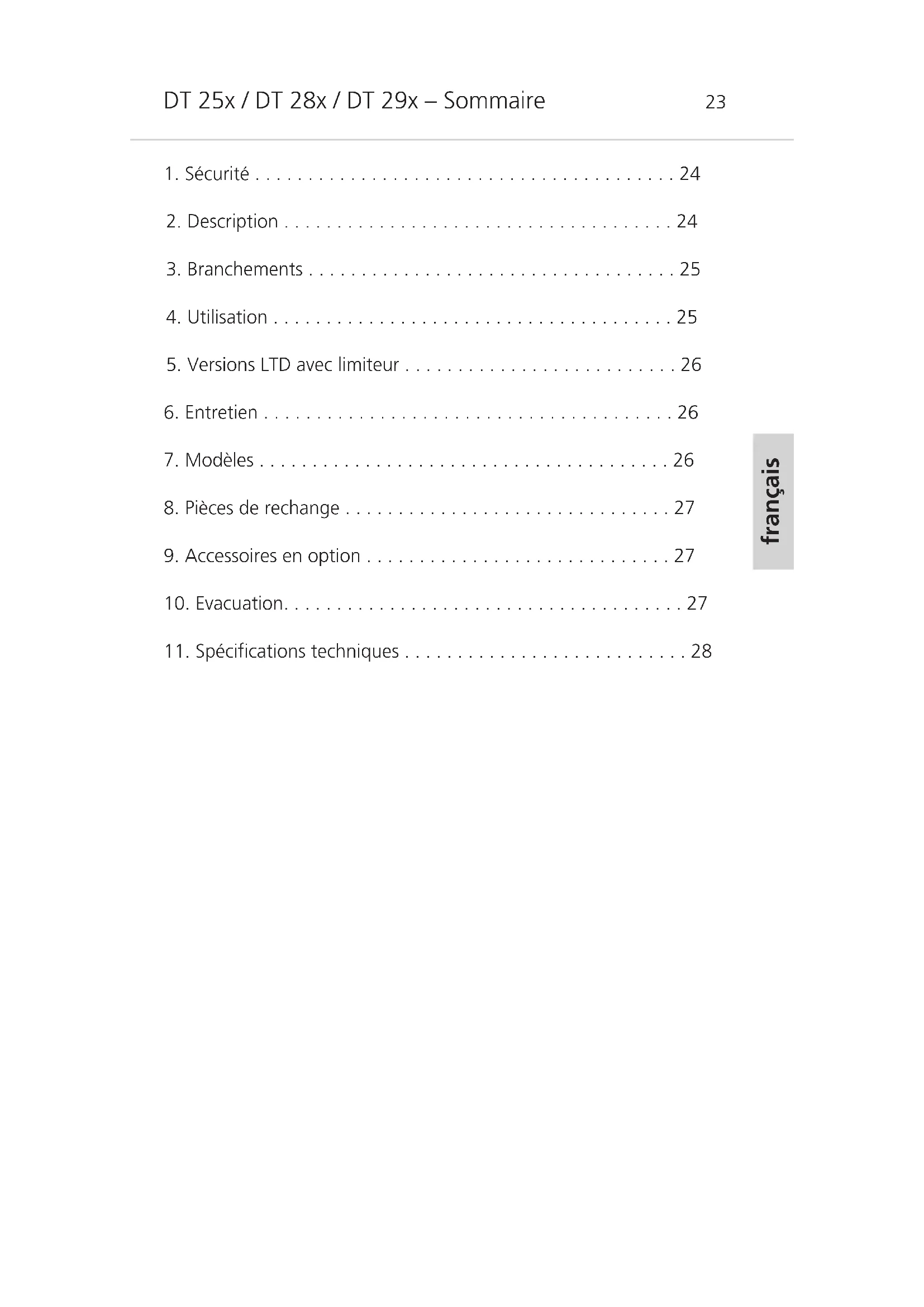 Ce symbole sur le produit, l’emballage ou dans le manuel signifie que votre équipement électrique et électronique doit être, en fin de vie, jeté séparement de vos déchets ménages. Il existe en France des systèmes de collecte différents pour les déchets recyclables. Pour plus d’infor- mation, veuillez contacter les autorités locales ou le revendeur chez qui vous avez acheté le produit.DT 25x / DT 28x / DT 29x