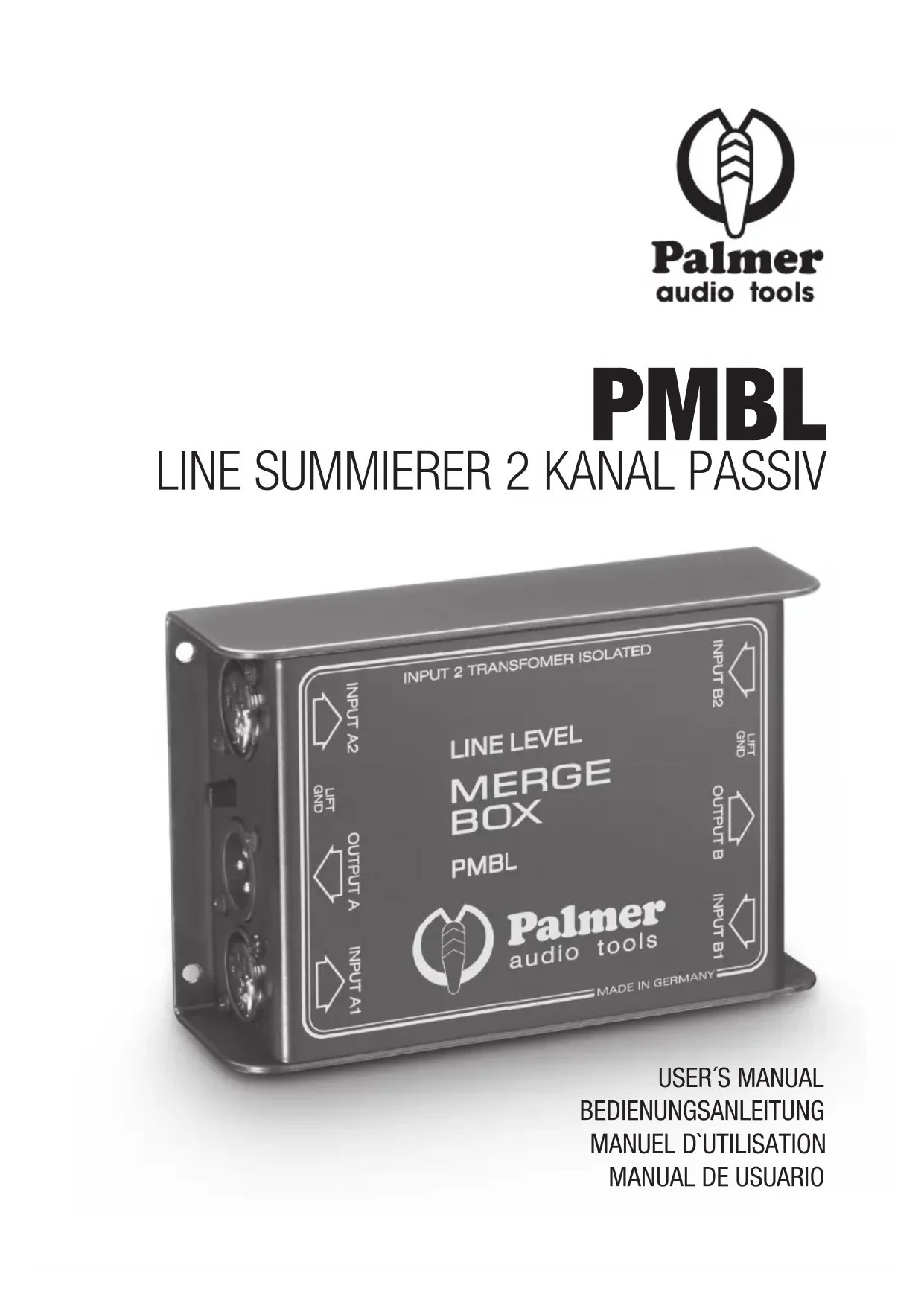 INTRODUCTION Lors du mixage de signaux électriques, les sources de signal s’influencent mutuellement. Les résistances de découplage peuvent réduire cet effet, mais un mixage sans perte n’est possible qu’avec des circuits actifs. Toutefois, une électronique active est plus complexe matériellement, ce qui se traduit par des coûts supérieurs. Dans quelques cas d’utilisation, cette complexité n’est pas désirable, et tant que le niveau de volume des signaux est suffisant, le mixage « passif » des signaux reste la méthode la plus efficace. C’est pour ces cas d’utilisation que Palmer a développé la Merge Box. Application typique : envoyer les sorties de deux tables de mixage vers un même amplificateur. Ou encore : sommer en mono un signal stéréo gauche/ droite.