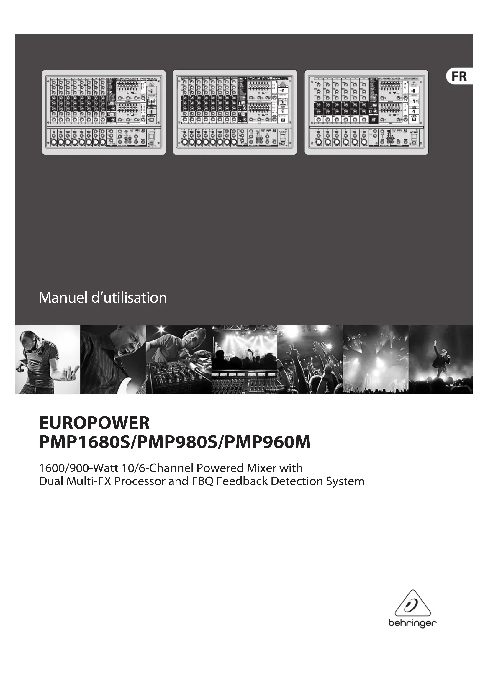 - 1600/900-Watt 10/6-Channel Powered Mixer with Dual Multi-FX Processor and FBQ Feedback Detection System2 EUROPOWER PMP1680S/PMP980S/PMP960M Manuel d’utilisation Merci Merci d’avoir choisi ce mélangeur amplié PMP de BEHRINGER. Ces mélangeurs orent des fonctions impressionnantes comme des eets numériques, deségaliseurs graphiques, un suppresseur de Larsen FBQ et une fonction unique de suppression de la voix – le tout dans un format léger et aisément transportable. Vous disposez d’un nombre complet d’entrées, d’options de routage, d’eets et d’options de conguration des étages de sortie pour vos répétitions, vos petits concerts ou tous vos besoins de sonorisation. Maispourquoi un mode d’emploi ? Nous savons que vous souhaitez utiliser votre mélangeur sans plus attendre, mais prenez cependant le temps de lire ce mode d’emploi et conservez-le pour toute consultation future. Ces instructions vous expliquent toutes les fonctions du mélangeur, et vous donnent des astuces d’utilisation qui vous permettront d’obtenir le meilleur son possible avec ce mélangeur amplié PMP. Après tout, ce qui compte c’est votre son. Table des matières Merci p. 2