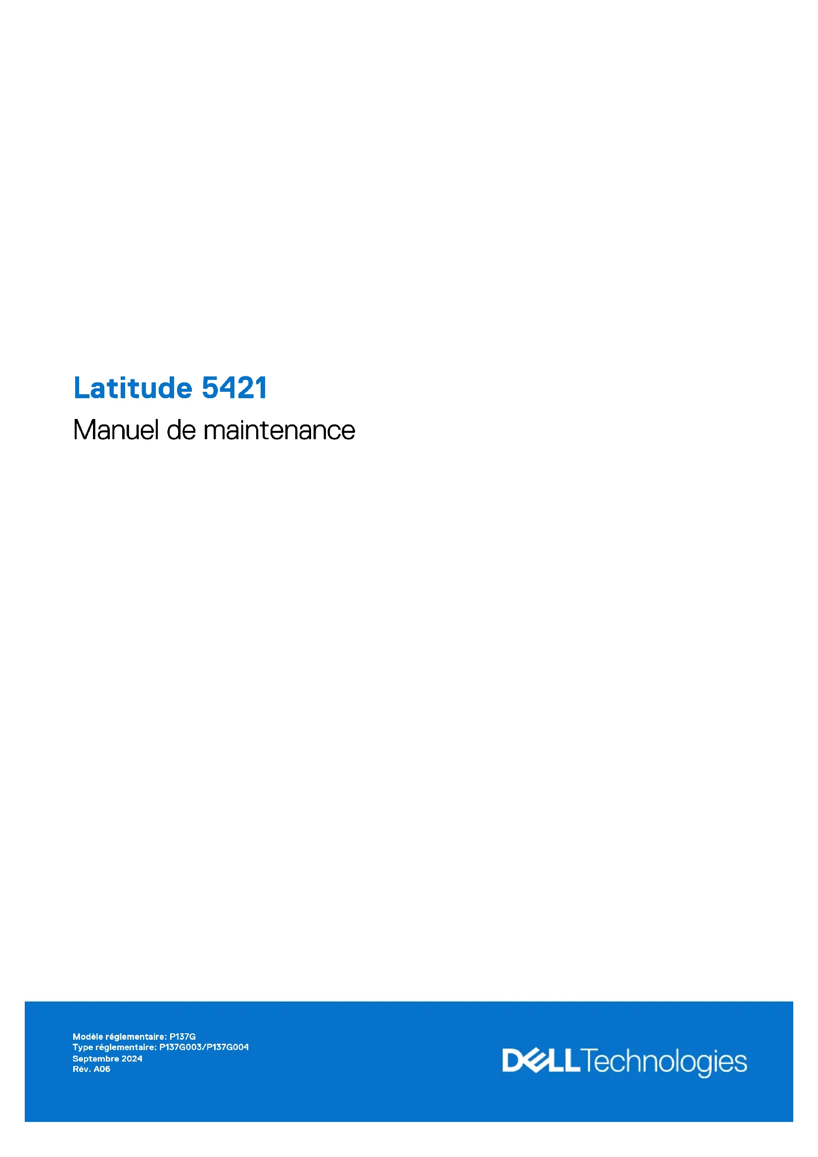 Latitude5421 Manuel de maintenance Modèle réglementaire: P137G Type réglementaire: P137G003/P137G004 Septembre 2024 Rév. A06Remarques, précautions et avertissements REMARQUE : Une REMARQUE indique des informations importantes qui peuvent vous aider à mieux utiliser votre produit. PRÉCAUTION : ATTENTION vous avertit d’un risque de dommage matériel ou de perte de données et vous indique comment éviter le problème.