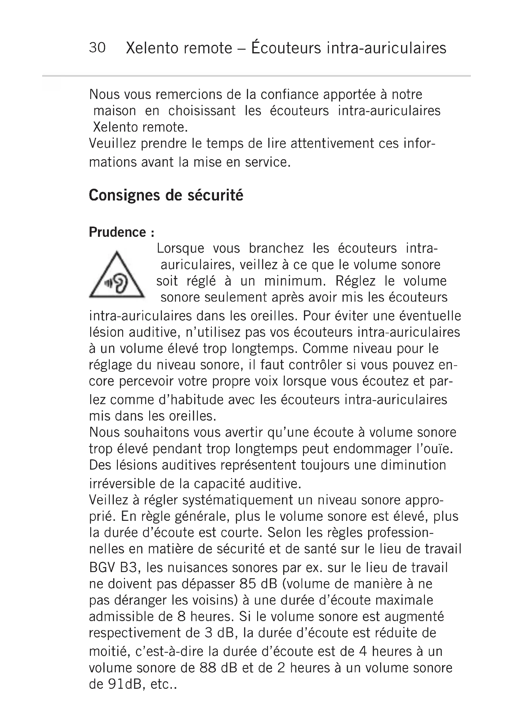Nous vous remercions de la confiance apportée à notre maison en choisissant les écouteurs intra-auriculaires Xelento remote. Veuillez prendre le temps de lire attentivement ces infor- mations avant la mise en service. Consignes de sécurité Prudence : Lorsque vous branchez les écouteurs intra- auriculaires, veillez à ce que le volume sonore soit réglé à un minimum. Réglez le volume sonore seulement après avoir mis les écouteurs intra-auriculaires dans les oreilles. Pour éviter une éventuelle lésion auditive, n’utilisez pas vos écouteurs intra-auriculaires à un volume élevé trop longtemps. Comme niveau pour le réglage du niveau sonore, il faut contrôler si vous pouvez en- core percevoir votre propre voix lorsque vous écoutez et par- lez comme d’habitude avec les écouteurs intra-auriculaires mis dans les oreilles. Nous souhaitons vous avertir qu’une écoute à volume sonore trop élevé pendant trop longtemps peut endommager l’ouïe. Des lésions auditives représentent toujours une diminution irréversible de la capacité auditive. Veillez à régler systématiquement un niveau sonore appro- prié. En règle générale, plus le volume sonore est élevé, plus la durée d’écoute est courte. Selon les règles profession- nelles en matière de sécurité et de santé sur le lieu de travail BGV B3, les nuisances sonores par ex. sur le lieu de travail ne doivent pas dépasser 85 dB (volume de manière à ne pas déranger les voisins) à une durée d’écoute maximale admissible de 8 heures. Si le volume sonore est augmenté respectivement de 3 dB, la durée d’écoute est réduite de moitié, c’est-à-dire la durée d’écoute est de 4 heures à un volume sonore de 88 dB et de 2 heures à un volume sonore de 91dB, etc..français Xelento remote – Écouteurs intra-auriculaires