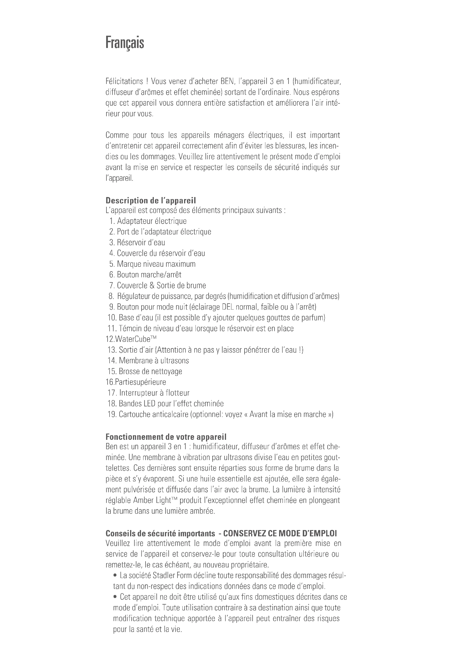 Fonctionnement de votre appareil Ben est un appareil 3 en 1 : humidificateur, diffuseur d’arômes et effet che- minée. Une membrane à vibration par ultrasons divise l’eau en petites gout- telettes. Ces dernières sont ensuite réparties sous forme de brume dans la pièce et s’y évaporent. Si une huile essentielle est ajoutée, elle sera égale- ment pulvérisée et diffusée dans l’air avec la brume. La lumière à intensité réglable Amber Light™ produit l’exceptionnel effet cheminée en plongeant la brume dans une lumière ambrée. Conseils de sécurité importants - CONSERVEZ CE MODE D’EMPLOI Veuillez lire attentivement le mode d‘emploi avant la première mise en service de l’appareil et conservez-le pour toute consultation ultérieure ou remettez-le, le cas échéant, au nouveau propriétaire.
