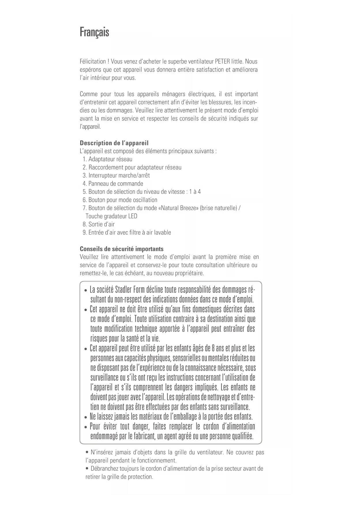 Téléchargez la notice de votre Ventilateur au format PDF gratuitement ! Retrouvez votre notice Peter little - STADLER FORM et reprennez votre appareil électronique en main. Sur cette page sont publiés tous les documents nécessaires à l'utilisation de votre appareil Peter little de la marque STADLER FORM.
