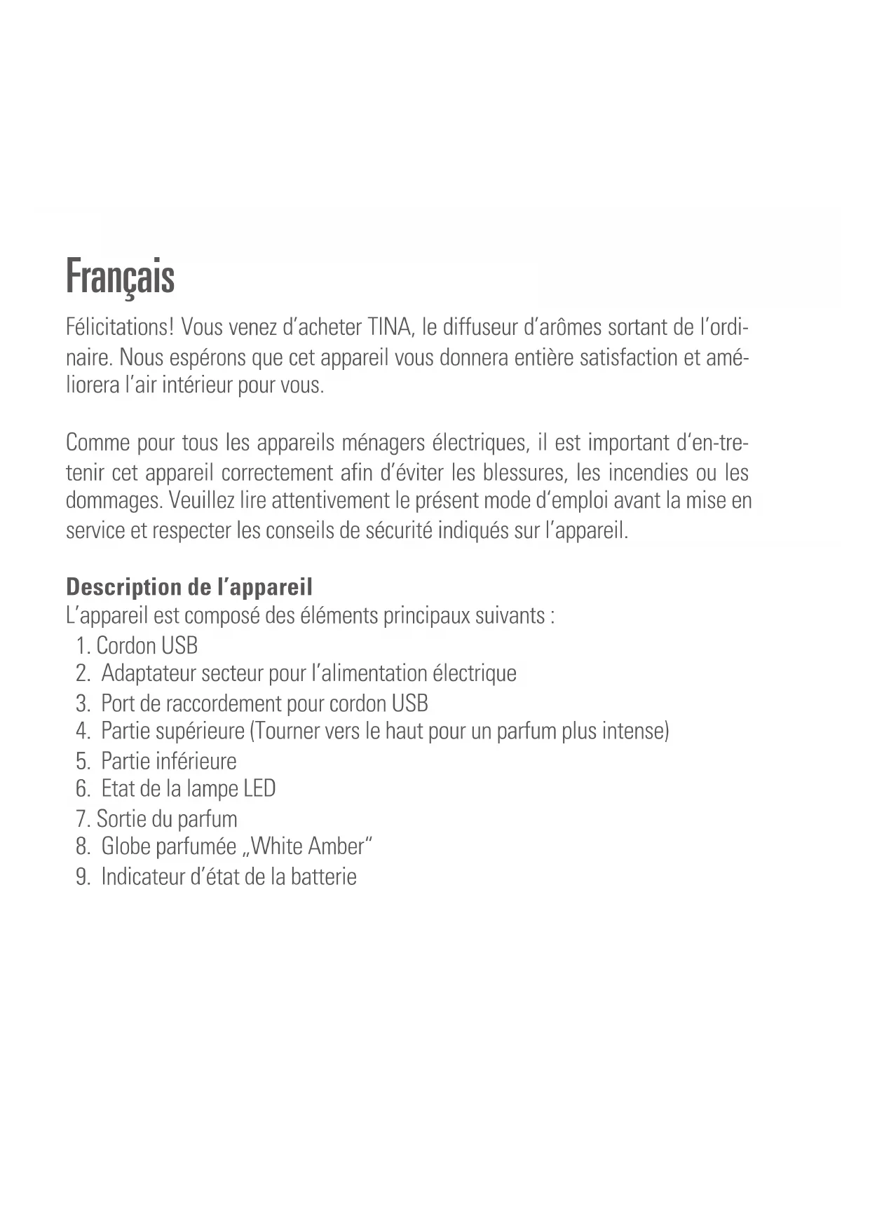 - La batterie est en cours de chargement : la LED est allumée en permanence. Lorsque l’appareil est entièrement rechargé, la LED s’éteint. Vous pouvez alors retirer le câble USB et utiliser l’appareil sur batterie (jusqu’à 30 h). Remarque: la gamme de globes parfumés comprend 6 parfums différents : Whi- te Amber, Orange Bergamot, Red Jasmine, Blue Rosewood, Black Orchid, Yellow Vanilla. Vous pouvez acheter les globes parfumés chez le commerçant où vous avez acheté votre Tina.Nettoyage Avant chaque entretien et après chaque emploi, éteindre l’appareil et retirer l’adaptateur de réseau de la prise de courant. Attention: Ne jamais plonger l’appareil dans l’eau (danger de court-circuit).