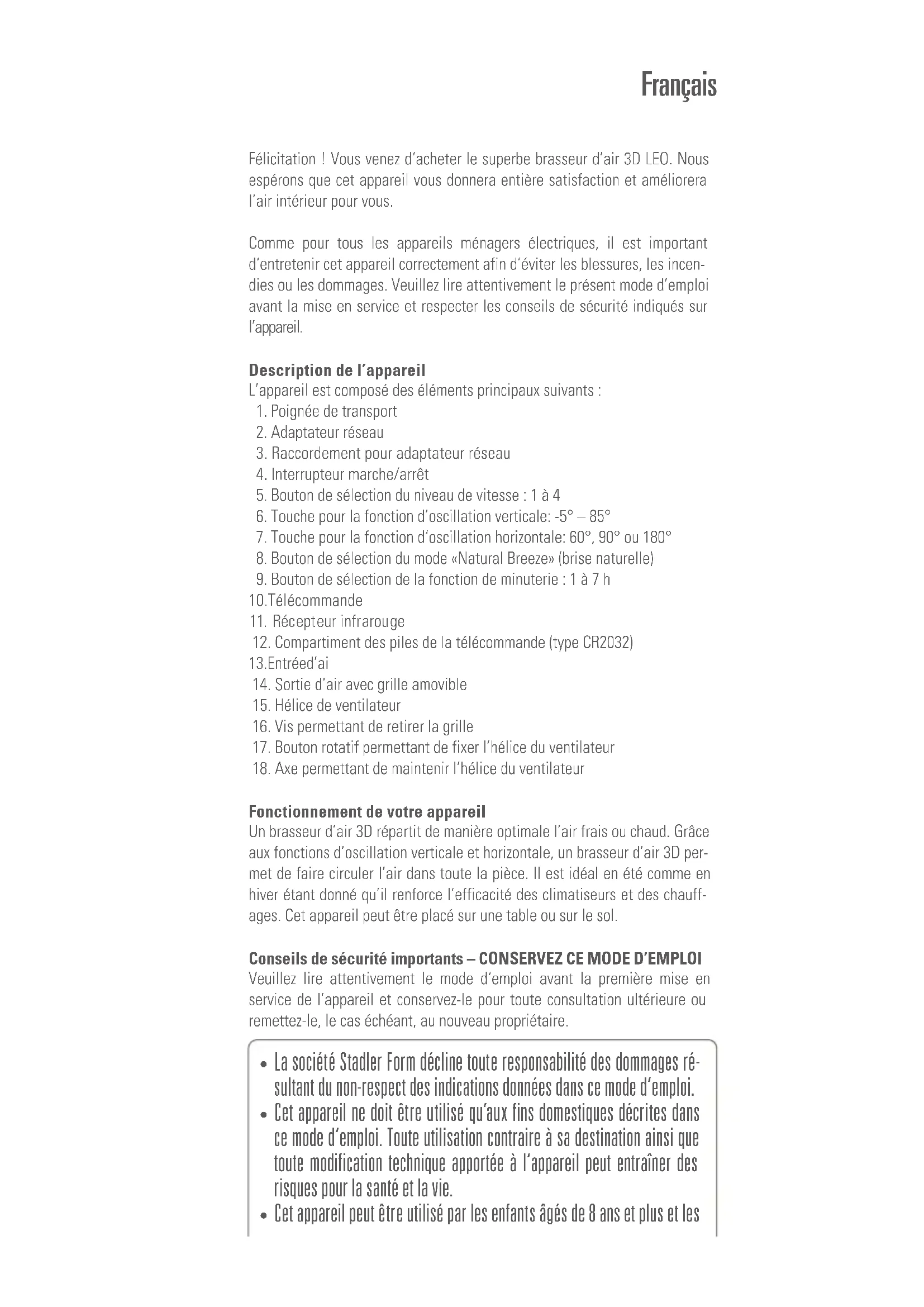 - If electrical appliances are disposed of thoughtlessly, exposure to the elements may cause hazardous substances to find their way into the groundwater and from there into the food chain, or to poison the flora and fauna for many years to come. Specifications Rated voltage 100–240 V / 50 Hz Rated power 1.5–18 W Dimensions 9.4 x 13.0 x 8.1 inch / 240 x 330 x 205 mm (width x height x depth) Weight 3.7 lbs / 1.7 kg Sound level 27–57 dB(A) Complies with regulations cETL All rights for any technical modifications are reservedFélicitation ! Vous venez d‘acheter le superbe brasseur d’air 3D LEO. Nous espérons que cet appareil vous donnera entière satisfaction et améliorera l’air intérieur pour vous. Comme pour tous les appareils ménagers électriques, il est important d‘entretenir cet appareil correctement afin d’éviter les blessures, les incen- dies ou les dommages. Veuillez lire attentivement le présent mode d’emploi avant la mise en service et respecter les conseils de sécurité indiqués sur l’appareil. Description de l’appareil L’appareil est composé des éléments principaux suivants :