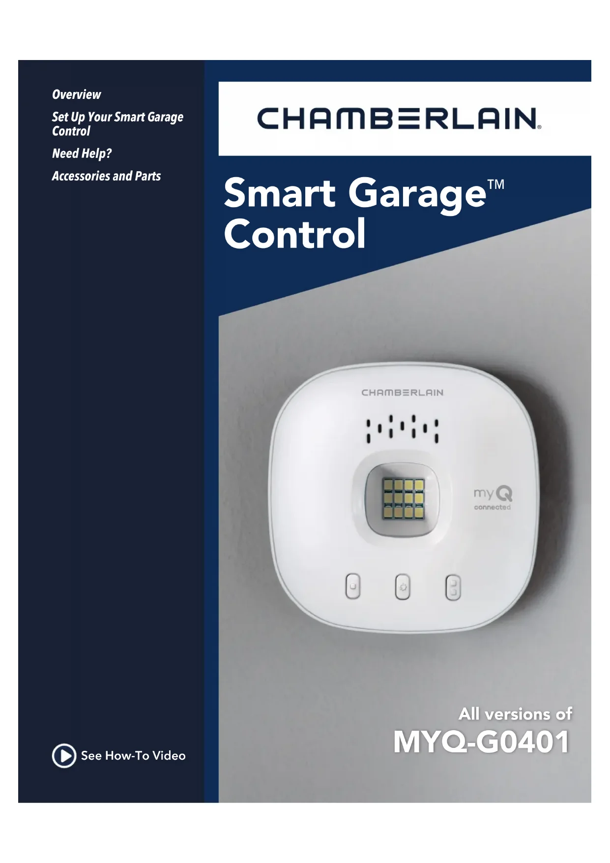 Toutes les versions de MYQ-G0401 Vue d’ensemble Congurez votre commande Smart Garage Besoin d’aide? Accessoires et pièces détachées Visionnez la vidéo du mode d’emploi56 Vue d’ensemble Contenu de la boîteSpécicationsApprenez à connaître votre commande Smart GarageBoutons et DEL Congurez votre commande Smart Garage Besoin d’aide? Accessoires et pièces détachées Vue d’ensemble Contenu de la boîte