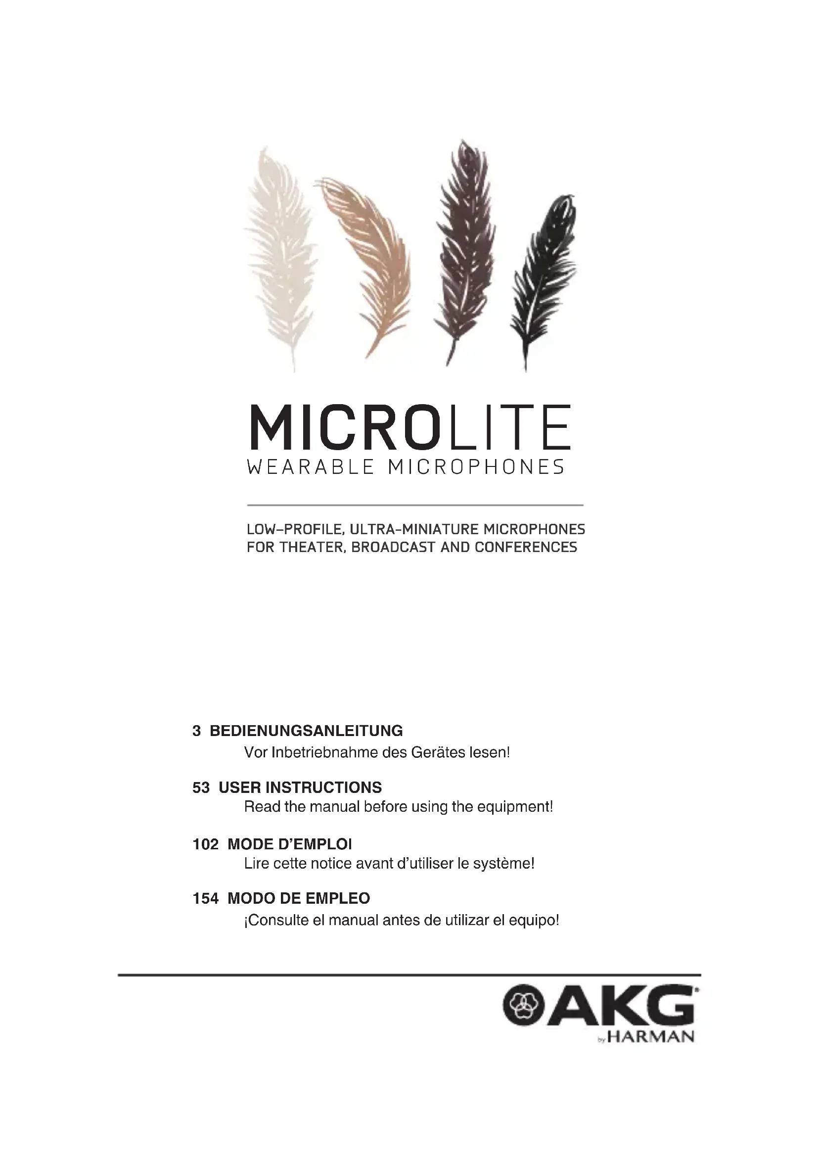 - N'utilisez l'appareil que pour les applications décrites dans le mode d'emploi. AKG ne saurait être tenu responsable des dommages induits par une utilisation non conforme ou une manipulation inappropriée. SécuritéMODE D'EMPLOI MICROLITE108 déCLARATION dE CONfORMITé
