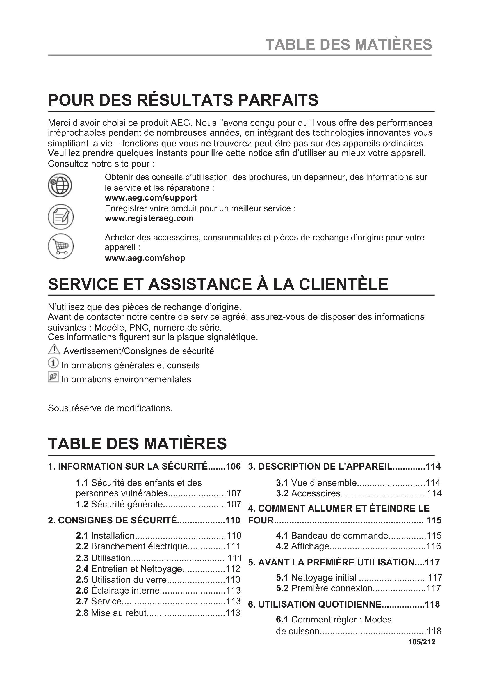 Kierrätä materiaalit, jotka on merkitty merkillä . Kierrätä pakkaus laittamalla se asianmukaiseen kierrätysastiaan. Suojele ympäristöä ja ihmisten terveyttä kierrättämällä sähkö- ja elektroniikkaromut. Älä hävitä merkillä merkittyjä kodinkoneita kotitalousjätteen mukana. Palauta tuote paikalliseen kierrätyskeskukseen tai ota yhteyttä paikalliseen viranomaiseen. 104/212 KÄYTÄ PIKAVALINTAA!POUR DES RÉSULTATS PARFAITS Merci d’avoir choisi ce produit AEG. Nous l’avons conçu pour qu’il vous offre des performances irréprochables pendant de nombreuses années, en intégrant des technologies innovantes vous simplifiant la vie – fonctions que vous ne trouverez peut-être pas sur des appareils ordinaires. Veuillez prendre quelques instants pour lire cette notice afin d’utiliser au mieux votre appareil. Consultez notre site pour : Obtenir des conseils d’utilisation, des brochures, un dépanneur, des informations sur le service et les réparations : www.aeg.com/support Enregistrer votre produit pour un meilleur service : www.registeraeg.com Acheter des accessoires, consommables et pièces de rechange d’origine pour votre appareil : www.aeg.com/shop