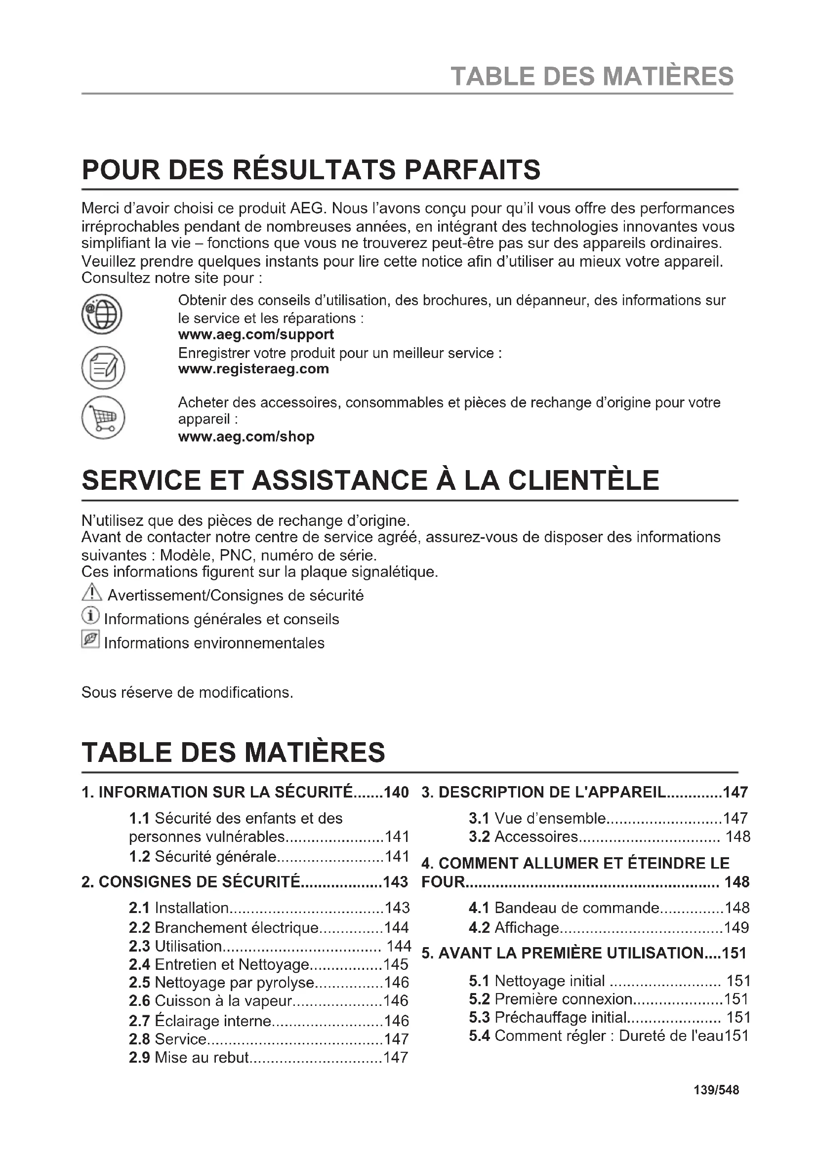 Sümboliga tähistatud materjalid võib ringlusse suunata. Selleks viige pakendid vastavatesse konteineritesse. Aidake hoida keskkonda ja inimeste tervist ja suunake elektri- ja elektroonilised jäätmed ringlusse. Ärge visake sümboliga tähistatud seadmeid muude majapidamisjäätmete hulka. Viige seade kohalikku ringluspunkti või pöörduge abi saamiseks kohalikku omavalitsusse. 138/548 KASUTAGE OTSETEED!POUR DES RÉSULTATS PARFAITS Merci d’avoir choisi ce produit AEG. Nous l’avons conçu pour qu’il vous offre des performances irréprochables pendant de nombreuses années, en intégrant des technologies innovantes vous simplifiant la vie – fonctions que vous ne trouverez peut-être pas sur des appareils ordinaires. Veuillez prendre quelques instants pour lire cette notice afin d’utiliser au mieux votre appareil. Consultez notre site pour : Obtenir des conseils d’utilisation, des brochures, un dépanneur, des informations sur le service et les réparations : www.aeg.com/support Enregistrer votre produit pour un meilleur service : www.registeraeg.com Acheter des accessoires, consommables et pièces de rechange d’origine pour votre appareil : www.aeg.com/shop