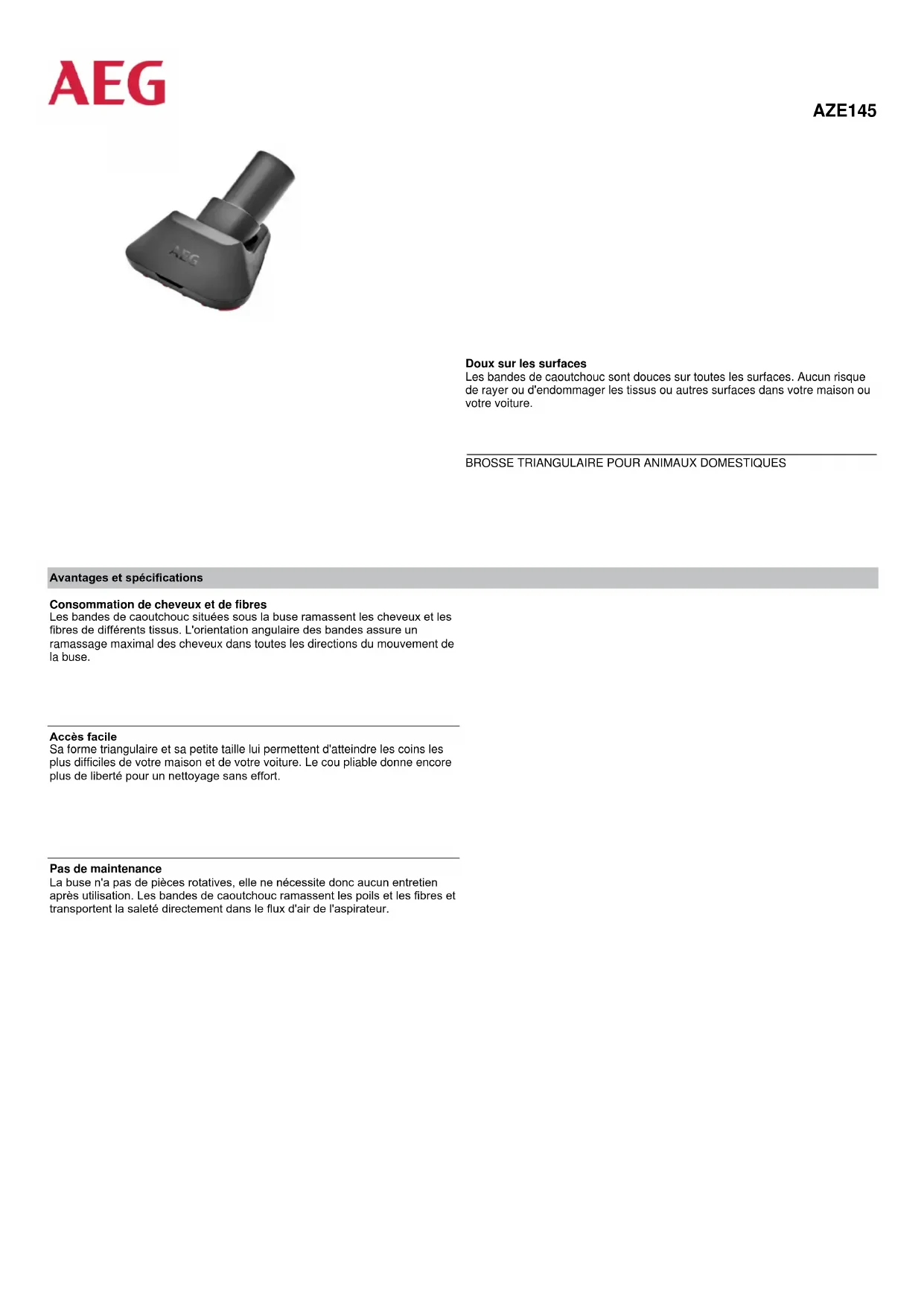 Accès facile Sa forme triangulaire et sa petite taille lui permettent d'atteindre les coins les plus difficiles de votre maison et de votre voiture. Le cou pliable donne encore plus de liberté pour un nettoyage sans effort. Pas de maintenance La buse n'a pas de pièces rotatives, elle ne nécessite donc aucun entretien après utilisation. Les bandes de caoutchouc ramassent les poils et les fibres et transportent la saleté directement dans le flux d'air de l'aspirateur. Consommation de cheveux et de fibres Les bandes de caoutchouc situées sous la buse ramassent les cheveux et les fibres de différents tissus. L'orientation angulaire des bandes assure un ramassage maximal des cheveux dans toutes les directions du mouvement de la buse.